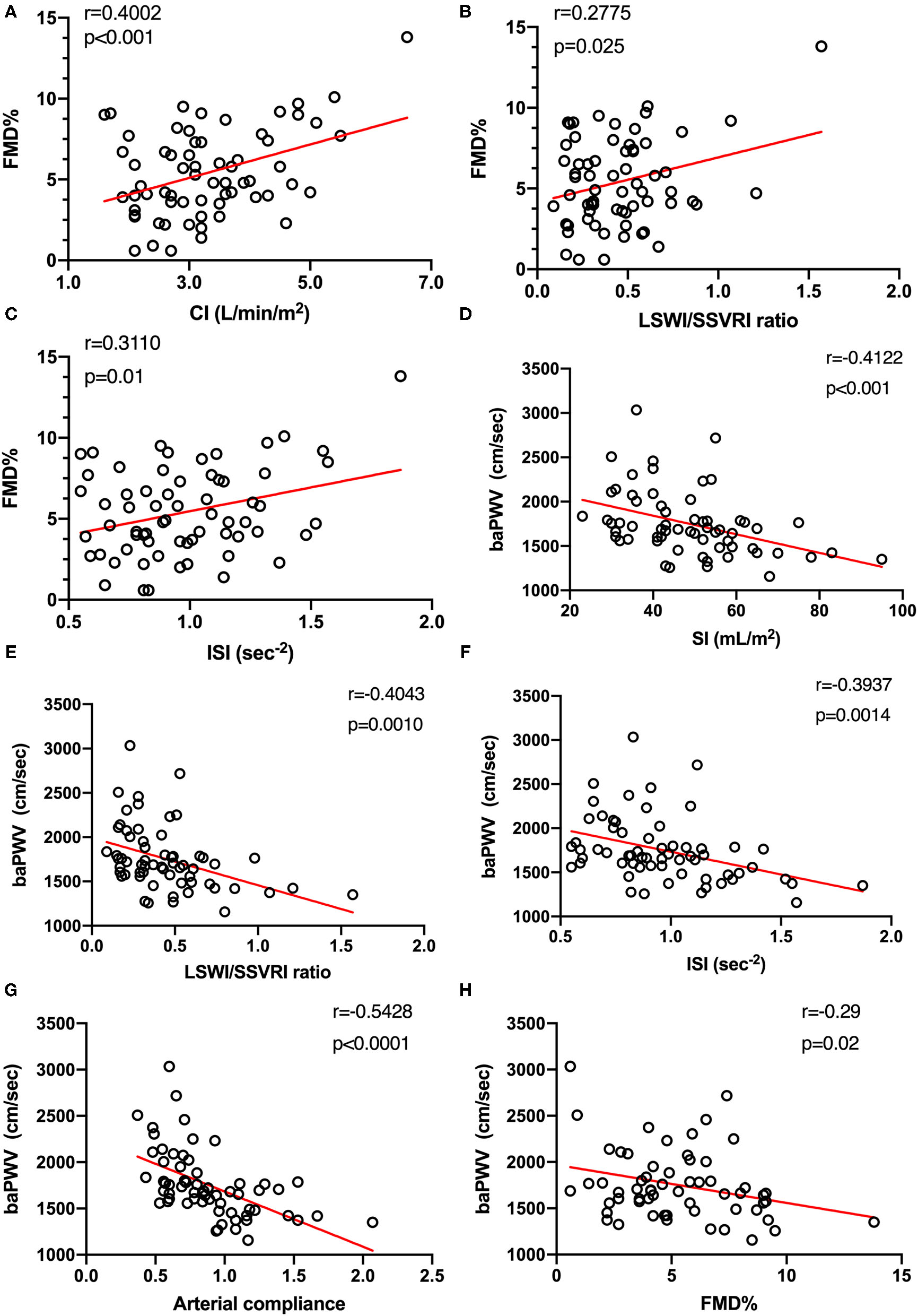 In addition, we urged to determine whether systemic hemodynamics was associated with arterial stiffness alteration. Moderate negative correlations between SI, LSWI/SSVRI ratio, ISI, and baPWV were found by Pearson's correlation test (Figures 2D–F). We also observed a moderate negative and significant correlation between arterial compliance and baPWV (r = −0.54, p < 0.0001, Figure 2G). Despite individual variations, SBP increase was associated with baPWV upregulation (r = 0.36, p < 0.01, Supplementary Figure 3). Moreover, FMD values showed a moderate negative and significant correlation with baPWV (r = −0.29, p = 0.02; Figure 2H), consistent with the concept that the combination of arterial endothelial function and arterial stiffness may provide further vascular risk assessment.