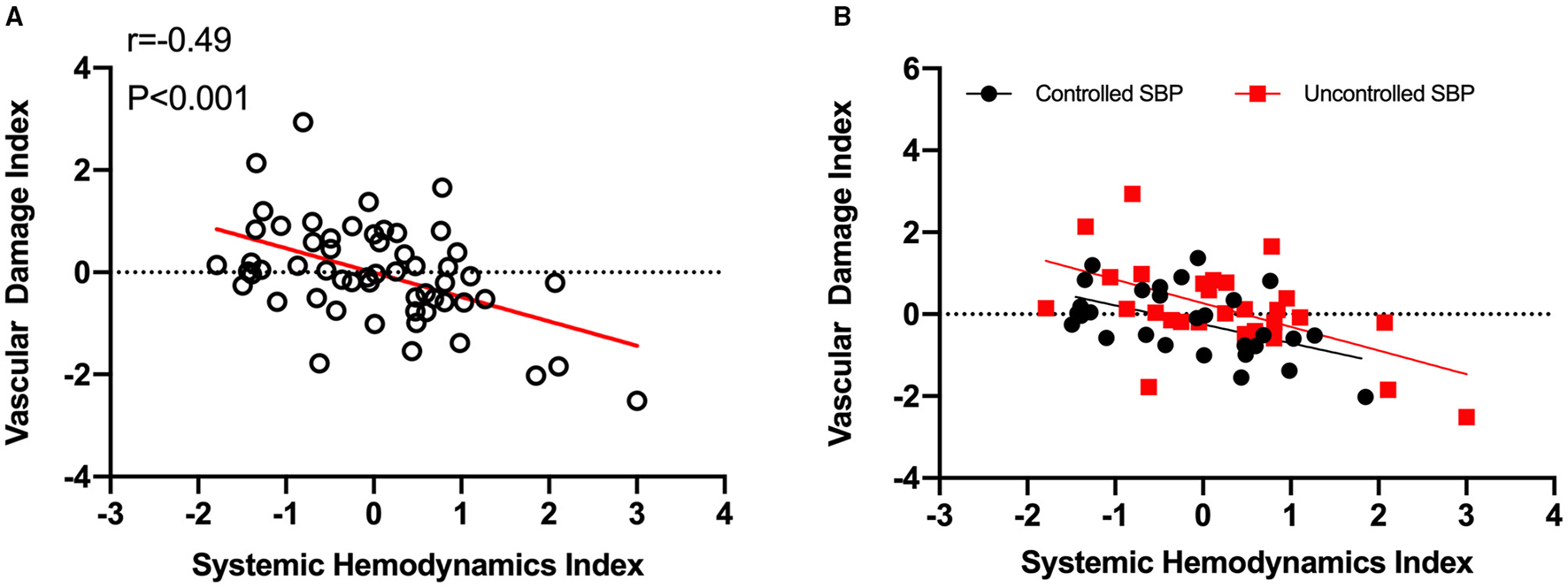 Hypertensive vascular impairment is associated with systemic hemodynamics index decline. (A), Systemic hemodynamics index decrease predicts vascular impairment in hypertensives. The systemic hemodynamics index showed a significantly negative correlation with vascular damage index (r = −0.49, p < 0.001). (B), Similar tendencies were discovered in both controlled (n = 29, r = −0.52, p < 0.01) and uncontrolled SBP (n = 28, r = −0.56, p < 0.01). SHI, systemic hemodynamics index; VDI, vascular damage index; SBP, systolic blood pressure.