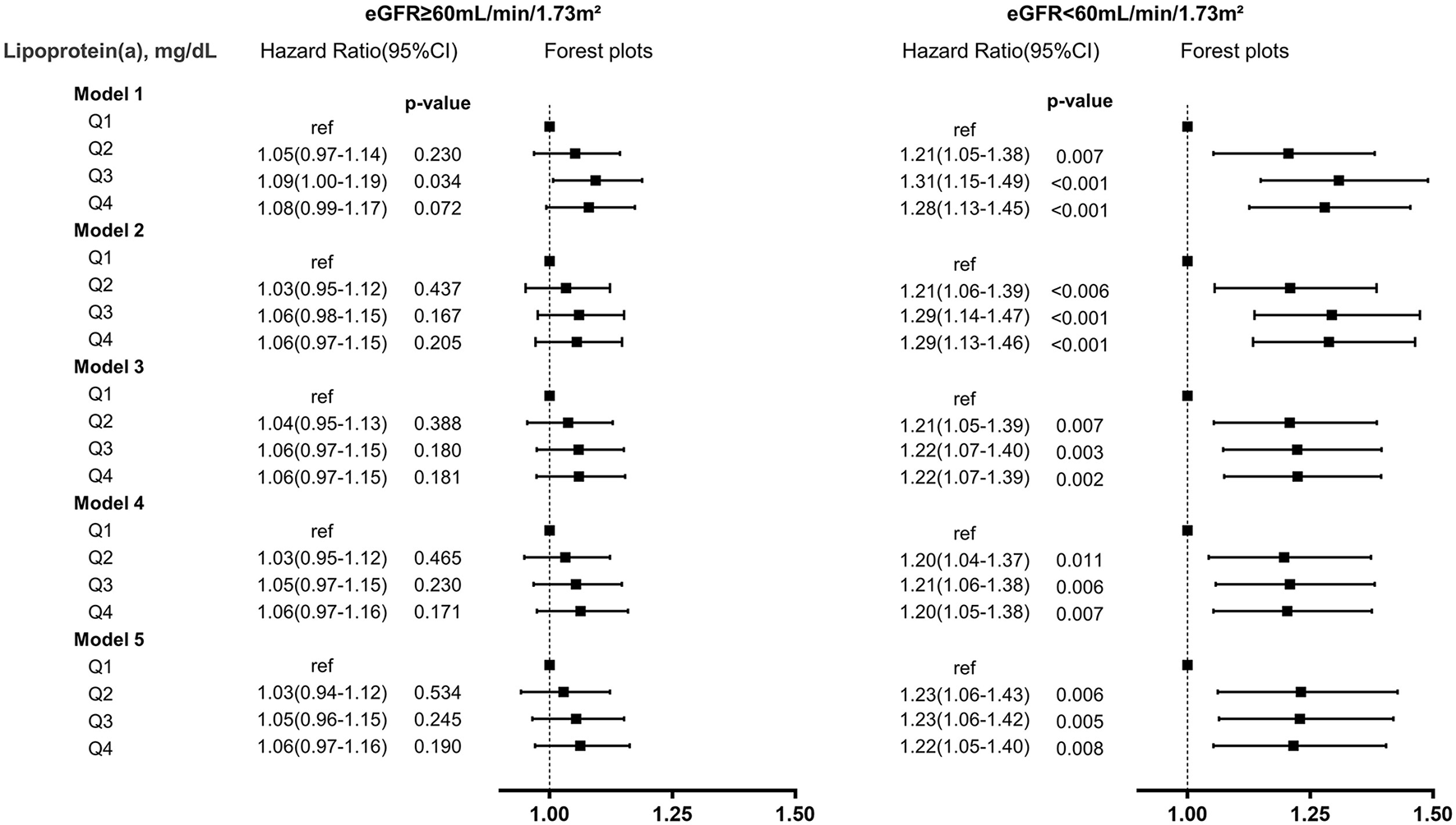 In patients with eGFR <60 mL/min/1.73m2, lipoprotein(a) Q2, Q3, and Q4 all had a 23% increased adjusted risk of death relative to Q1 (All of p <0.05). In patients with eGFR ≥60 mL/min/1.73m2, there were not significantly differences in adjusted risk of death between lipoprotein(a) Q2, Q3 as well as Q4 and Q1, respectively (Figure 1). In the subsequent analyses, lipoprotein(a) was dichotomized into low-risk group (Q1) and high-risk group (Q2–Q4). The cumulative hazard for all-cause mortality across lipoprotein(a) (Q1 vs. Q2–Q4) and eGFR categories shown in Figure 2. Compared with lipoprotein(a) Q1, lipoprotein(a) Q2–Q4 was strongly associated with increased adjusted risk of death in patients with eGFR <60 mL/min/1.73m2 (HR: 1.23 [95% CI: 1.08–1.39]), while such association was not significant in patients with eGFR ≥60 mL/min/1.73m2 (HR: 1.05 [95% CI: 0.97–1.13]). P for interaction between lipoprotein(a) (Q1 vs. Q2–Q4) and eGFR (≥60 vs. eGFR <60 mL/min/1.73m2) on all-cause mortality was 0.019 (Table 3). More information on confounding variables of Table 3 can be detailed in Supplementary Table 3.