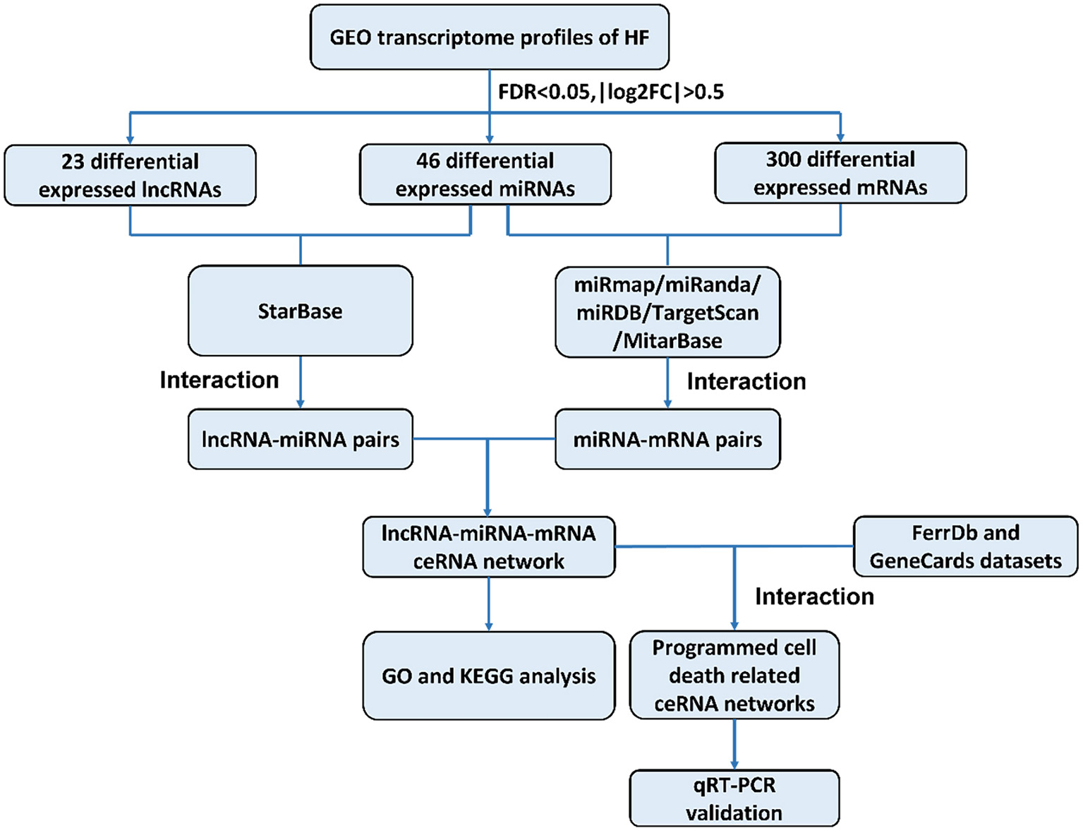 ceRNA network had been reported as a crucial mechanism to explain the regulation of post-transcriptional gene translation (12). It has been found that lncRNA APF targets the regulation of miR-188-3p, thereby affecting the expression of ATG7 in autophagy, which can effectively reduce the area of myocardial infarction, prevent HF, and prolong survival time (13). LncRNA kcnq1ot1 was demonstrated to increase HDAC3 expression by competitively binding to miR-452-3p, followed by the inhibition of ABCA1 and cholesterol efflflux, promoted macrophage lipid accumulation and accelerated the development of atherosclerosis (14). The above findings highlighted the importance of ceRNA network, a global view of lncRNA-mediated ceRNA network may help researchers comprehensively understand the pathophysiological process of cardiovascular diseases. Nonetheless, limited evidence was found in the research field of HF and more regulatory pathways still need further verification. Considering the essential role of programmed cell death in HF, it promoted us to think about the question that “whether there are interactions between lncRNA-mediated ceRNA network and programmed cell death?” Apart from one recent study of circRNA-miRNA-mRNA regulatory network on iron homeostasis (15), there were limited evidence to reveal the interactions between these two elements. The answers to this question may renew our knowledge in the regulation of pathophysiological process after HF.