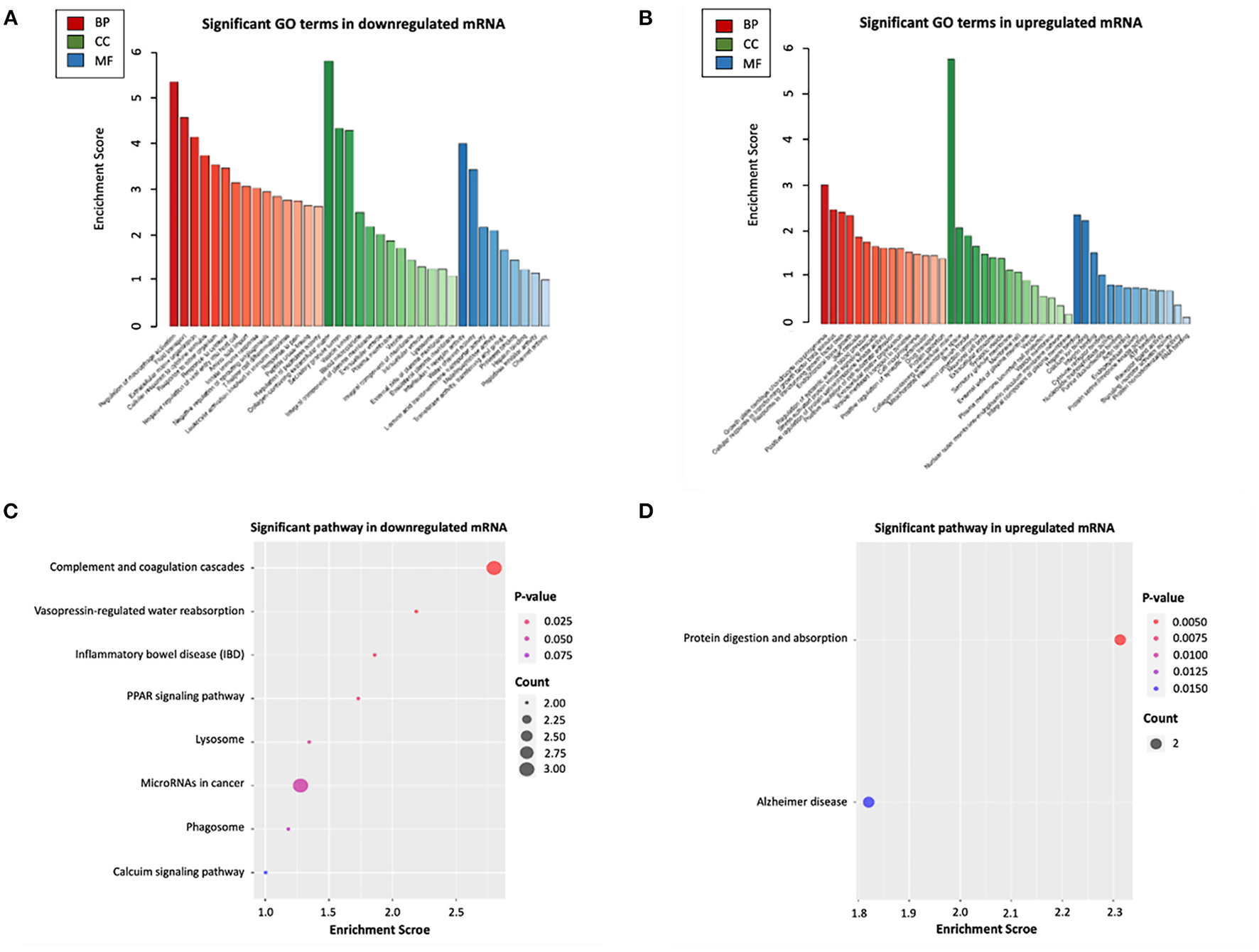 Functional enrichment analysis of differentially expressed mRNAs in ceRNA networks. (A) GO biological functional analyses of downregulated mRNA; (B) GO biological function analyses of upregulated mRNA; (C) KEGG pathway analyses of downregulated mRNA; (D) KEGG pathway analyses of upregulated mRNA. BP, biological process; CC, cellular component; MF, molecular function; GO, Gene Ontology.