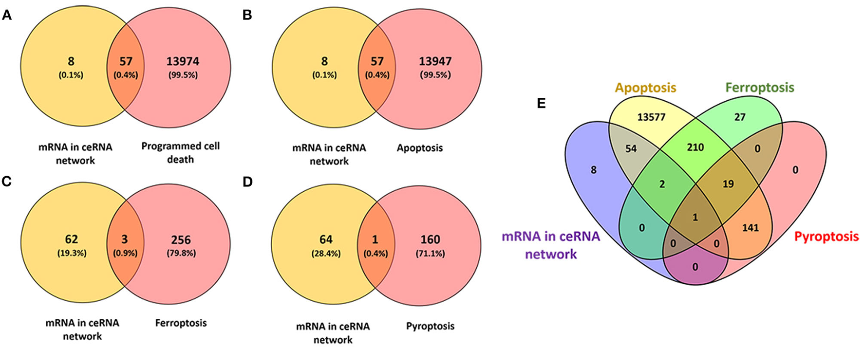 Identification of the candidate programmed cell death related genes in the ceRNA networks. (A) Venn diagram to identify common mRNAs between differentially expressed mRNAs in our ceRNA networks and programmed cell death related mRNAs; (B) Venn diagram to identify common mRNAs between differentially expressed mRNAs in our ceRNA networks and apoptosis related mRNAs; (C) Venn diagram to identify common mRNAs between differentially expressed mRNAs in our ceRNA networks and ferroptosis related mRNAs; (D) Venn diagram to identify common mRNAs between differentially expressed mRNAs in our ceRNA networks and pyroptosis related mRNAs; (E) Interactions between differentially expressed mRNAs in our ceRNA networks and apoptosis, ferroptosis, pyroptosis related mRNAs.