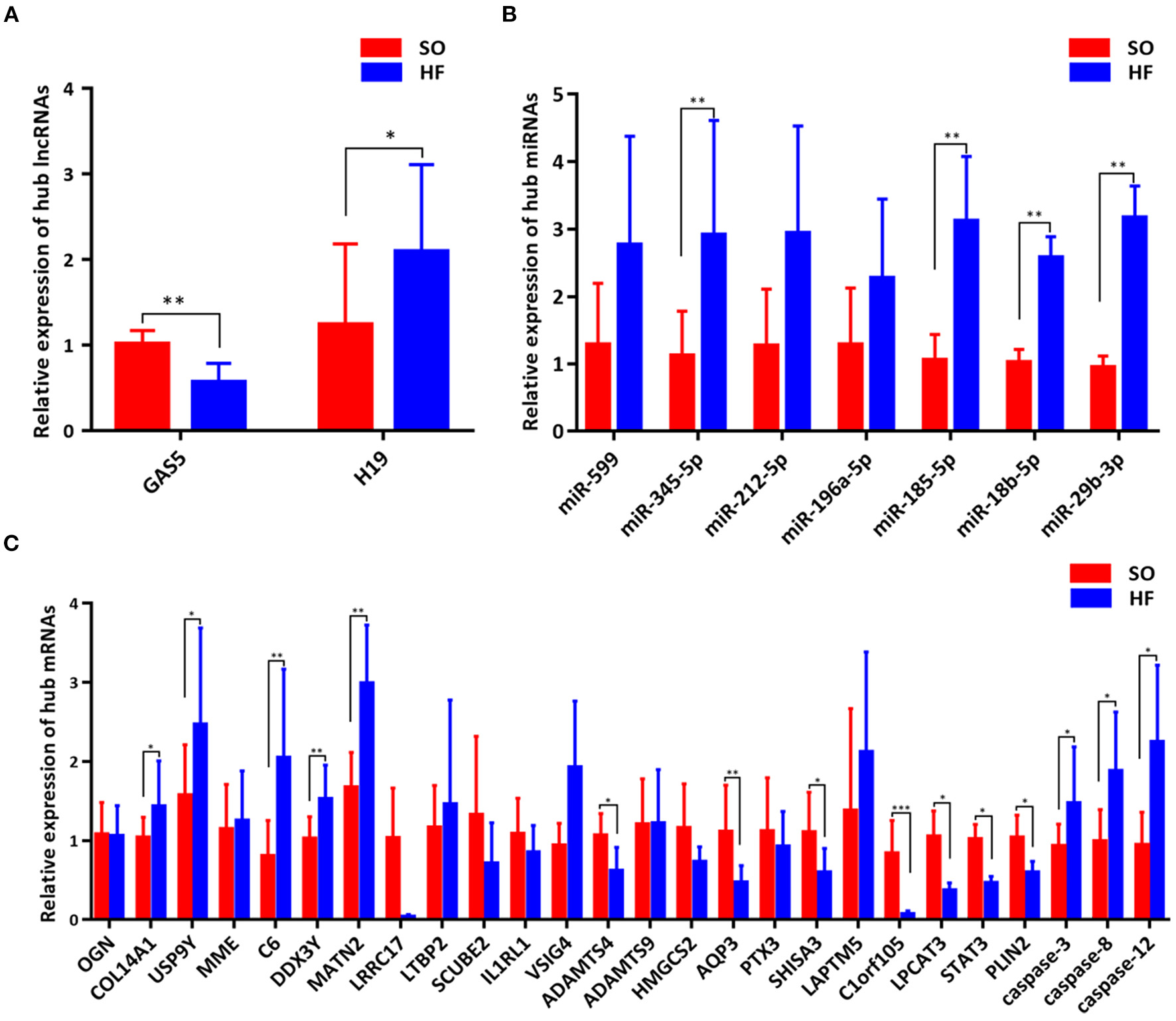 Validation of genes in the programmed cell death regulatory pathways. (A) Expression of hub lncRNAs in ceRNA networks; (B) Expression of hub miRNAs in ceRNA networks; (C) Expression of hub mRNAs in ceRNA networks. *P < 0.05; **P < 0.01; ***P < 0.001.