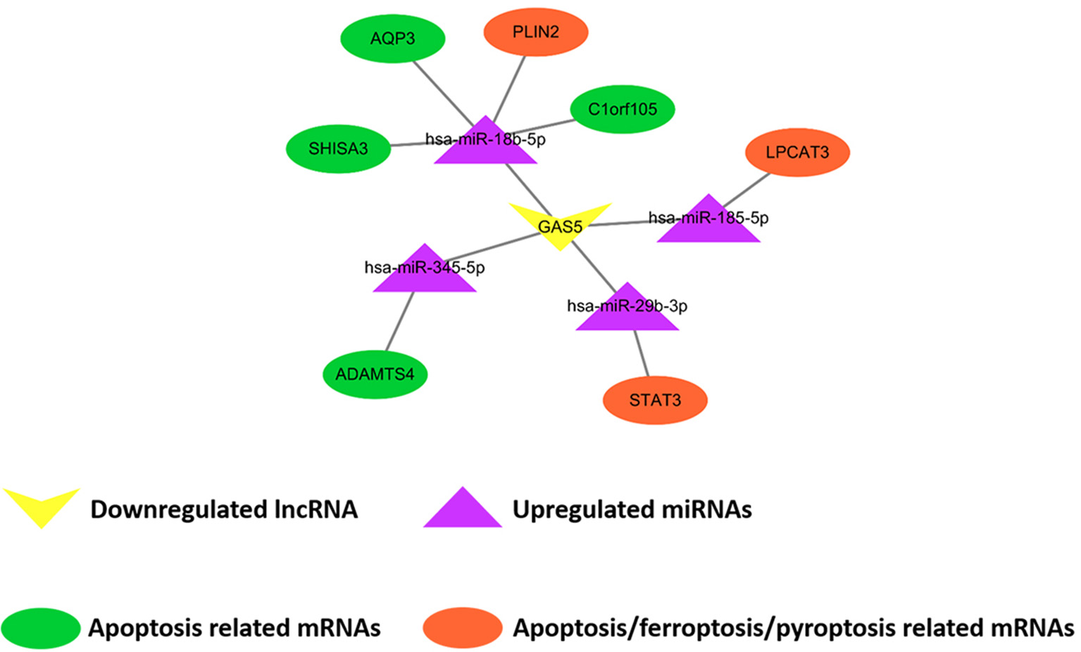 Demonstration of proposed lncRNA GAS5-mediated ceRNA regulatory networks on programmed cell death. The rectangle, triangles, and circles represent lncRNAs, miRNAs and mRNAs, respectively. The circles highlighted in orange and green indicate apoptosis related mRNAs, the circles highlighted in orange indicate ferroptosis related mRNAs, and the circle highlighted in orange (STAT3) indicates pyroptosis related mRNAs.