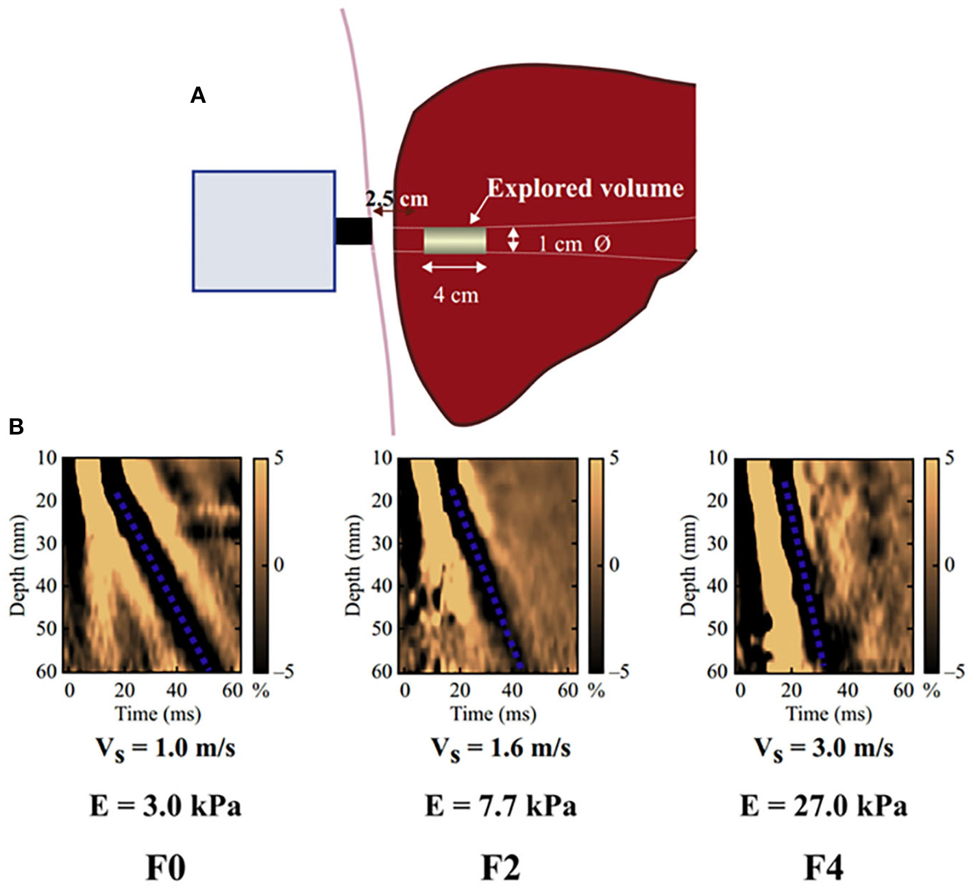 Schematic diagram of the basic principles of hepatic transient elastography. (A) Schematic diagram of basic principles of transient elastic imaging of liver. (B) Judging the severity of liver fibrosis according to shear wave propagation velocity. The elastic modulus E is expressed as E = 3ρV2, where V is the shear velocity and ρ is the mass density (constant and close to 1 kg/m3 for the tissue): the harder the tissue, the faster the shear wave propagates. In the absence of fibrosis (F0), the speed was 1.0 m/s and the elasticity was 3 kPa, while in the case of cirrhosis (F4), the speed was 3.0 m/s and the elasticity was 27 kPa.