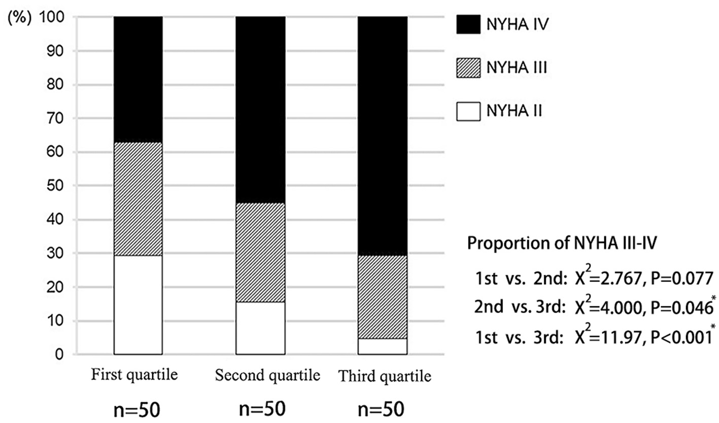 The clinical features of the present study's subjects are summarized in Supplementary Table 2. The third quartile group had a higher prevalence of diabetes and atrial fibrillation. The proportion of NYHA III-IV in the third quartile was also significantly higher than that of other groups (Figure 2). However, there was no significant difference in LVEF among the three groups. Although LVDd increased from the first to the third quartile groups, there was no statistical difference. There was no statistical difference in the prevalence of patients with hypertension, hyperlipidemia, coronary heart disease, chronic kidney disease, chronic obstructive pulmonary disease and anemia among the three groups.