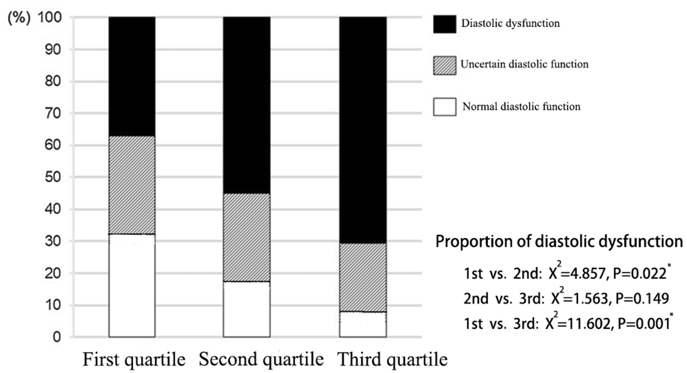 According to the assessment criteria of left ventricular diastolic dysfunction as shown in section Method, the left ventricular diastolic function of each patient was assessed, and the number of patients with left ventricular diastolic dysfunction in each group was compared (Table 3). As a result, the proportion of patients with normal diastolic function in the three groups showed a decreasing trend, and the proportion of patients with normal diastolic function in the third quartile was significantly lower than that in the first quartile (P = 0.008). On the contrary, proportion of patients with diastolic dysfunction in the third quartile was significantly higher than that in the first quartile (P = 0.017; Figure 3).