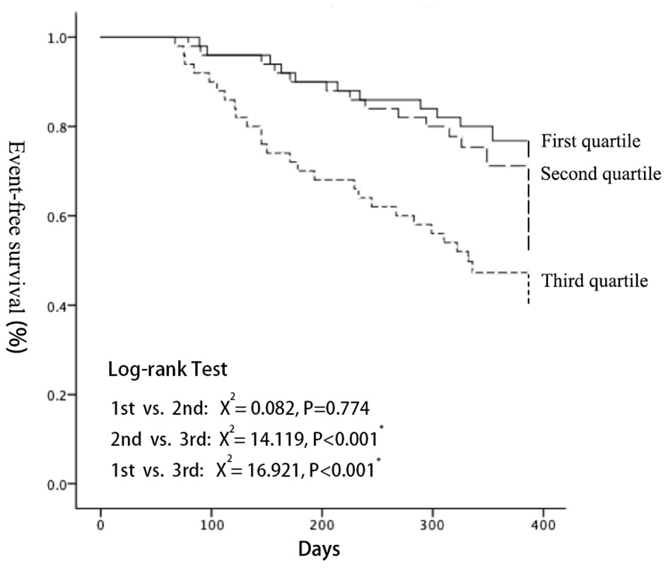 In terms of laboratory data, as the overall value of NT-proBNP does not meet the normal distribution (P = 0.034), we take the logarithm of the NT-proBNP and then compare it between groups. As a result, the third quartile group had the highest lgNT-proBNP, as well as levels of abumin/globulin ratio (A/G), total bilirubin, direct bilirubin and indirect bilirubin. In contrast, ALT, AST, alkaline phosphatase (ALP), γ-glutamyl transferase (GGT), lipid levels and the electrolyte did not differ significantly among the three groups.