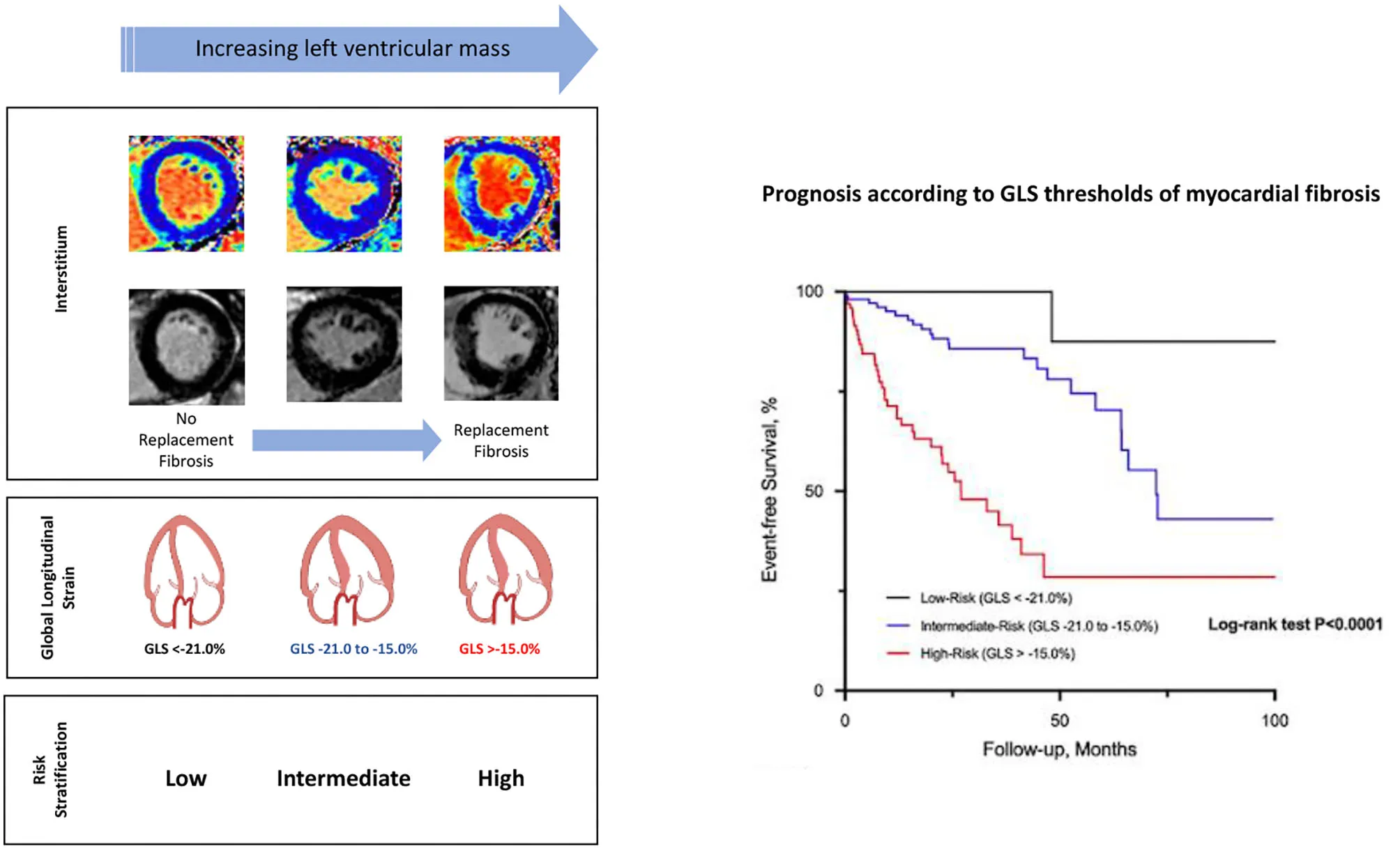 Thresholds of echocardiographic left ventricular global longitudinal strain (GLS) that are associated with replacement myocardial fibrosis risk-stratify patients with aortic stenosis and preserved left ventricular ejection fraction. Some images in the figure were created with BioRender.com.