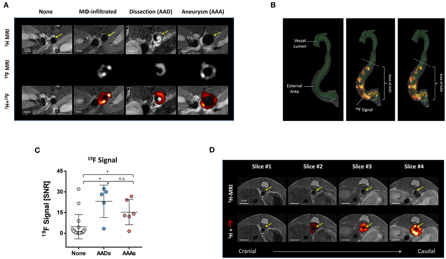 Of note, in some mice we also observed 19F signals in anatomically inconspicuous regions outside the area of AAAs/AADs. In Figure 3D, four slices in caudal direction ending at the upper end of an aortic dissection (slice #4) are shown. In slice #4 at the beginning of the AAA, one can recognize the thrombus as part of the AAD together with strong 19F signals. However, the slices #1–#3 above the dissection do not show any obvious changes in the anatomical 1H MRI images, but nevertheless clear 19F signals around the aortic wall are visible.