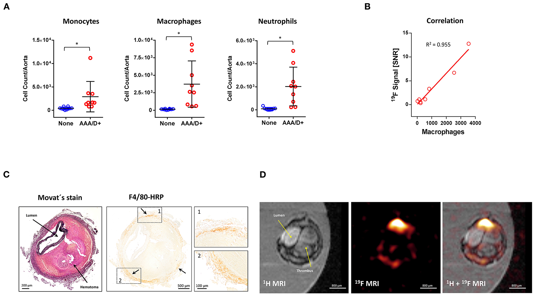 Flow cytometric and histological validation of in vivo MRI data. (A) Flow cytometry of myeloid immune cells isolated on day 10 of angII treatment from aortae without AAA/AAD or vascular inflammation (None) and aortae with AAA/AAD (AAA/D+). (B) Correlation of the vascular 19F signal with the total number of aortic macrophages determined by flow cytometry. (C) Histological sections were stained with Movat's (left) or incubated with antibodies against F4/80 followed by horseradish peroxidase (HRP) reaction (right). Arrows show the localization of the brown HRP-positive signals. The dashed lines indicate the magnified areas on the right (D) High resolution ex vivo1H/19F MRI measurements of an excised and paraformaldehyde fixed aorta with AAD that was embedded in agarose. Data are statistically significant with *p ≤ 0.05.
