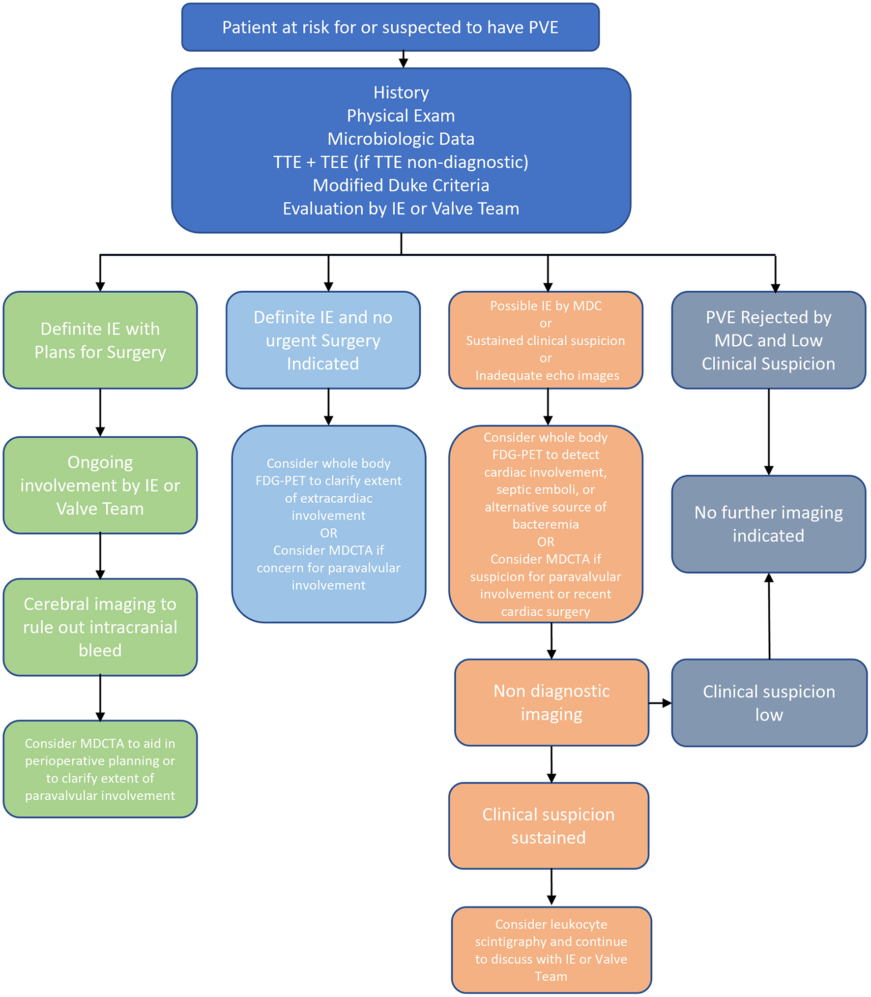 Overview of Diagnosis of PVE. FDG-PET, 18F-fluorodeoxyglucose positron emission tomography; IE, infective endocarditis; MDC, modified duke criteria; MDCTA, multidetector computed tomographic angiography; NVE, native valve endocarditis; PVE, prosthetic valve endocarditis; TEE, transesophageal echocardiogram; TTE, transthoracic echocardiogram.