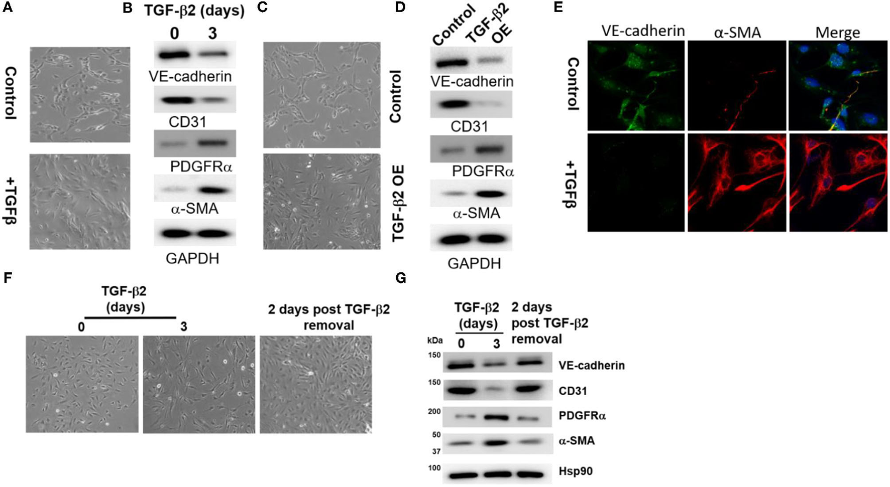 TGF-β2 induces EndMT in HAECs. (A) The morphological change of HAECs before and after a 3-day TGF-β2 treatment. Scale bars, 100 μm. (B) WB detection of the expression of the EndMT markers VE-cadherin, CD31, PDGFRα, and αSMA. Hsp90 was used as a loading control. (C,D) Same experiments were performed as those in (B,A) to control HAECs and TGF-β2-overexpressing HAEC cells. (E) Immunostaining of VE-cadherin and αSMA in control HAECs and HAECs treated with TGF-β2 for 3 days. Scale bars, 100 μm. Experiments were repeated three times. (F) The morphological change of HAECs 2 days post TGF-β2 removal following a 3-day TGF-β2 treatment. (G) Immunoblotting for the expression of the EndMT markers VE-cadherin, CD31, PDGFRα, and αSMA in HAECs for (F). Hsp90 was used as a loading control.