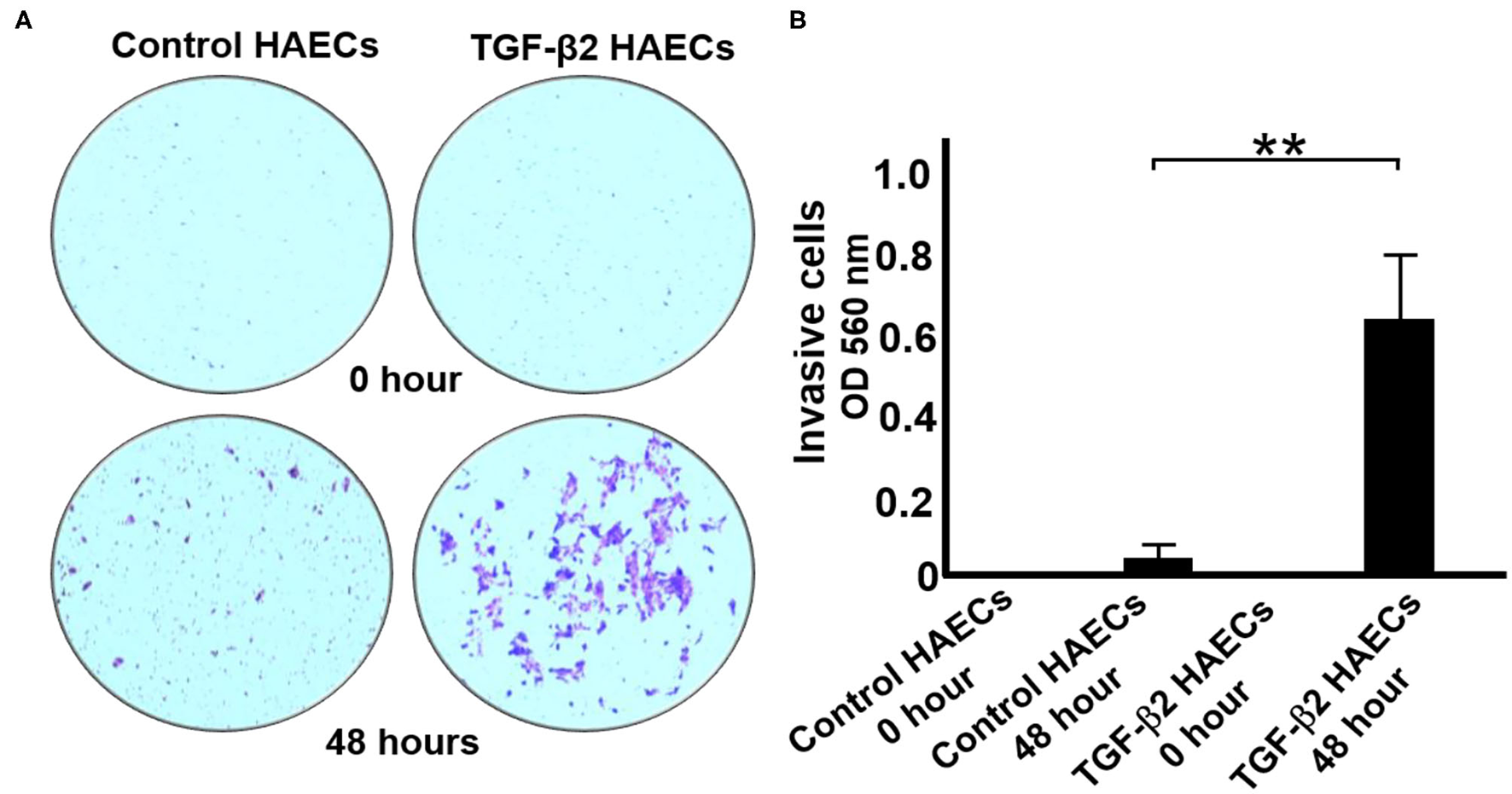 A cell invasion assay of the effect of TGF-β2 treatment of HAECs. (A) The comparison of invasive capabilities between control HAECs and TGF-β2-overexpressing HAECs. Top: The cells on the bottom of the basement membrane before the invasion (0 h). Bottom: The cells on the bottom of membrane after 48 h of invasion. (B) The quantification of cell invasion assays in (B). n = 3, **P < 0.01.