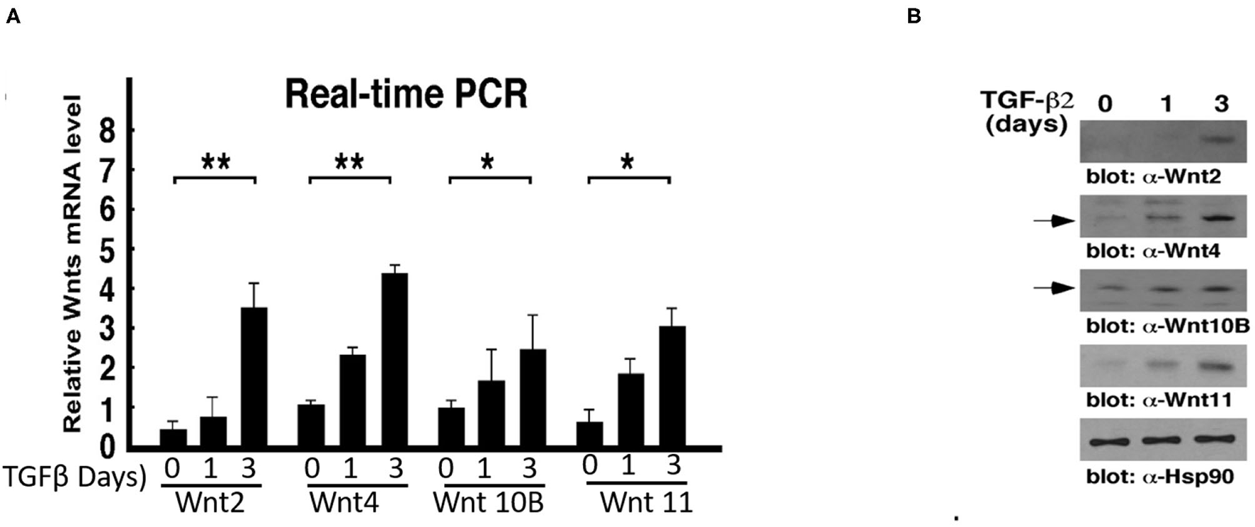 Wnt ligand expression is upregulated during TGF-β-mediated EndMT. (A) RT-PCR analysis of Wnt2, Wnt4, Wnt10B, and Wnt11 mRNA expression during TGF-β-mediated EndMT for different time courses. Each value represents the mean ± SD of three separate experiments. n = 3, *P < 0.05, **P < 0.01. (B) WB analysis of Wnt ligand protein expression during TGF-β-mediated EndMT. WCLs collected from cells treated with TGF-β2 for 0, 1, and 3 days were subjected to WB analysis. Hsp90 protein expression is used as a loading control.