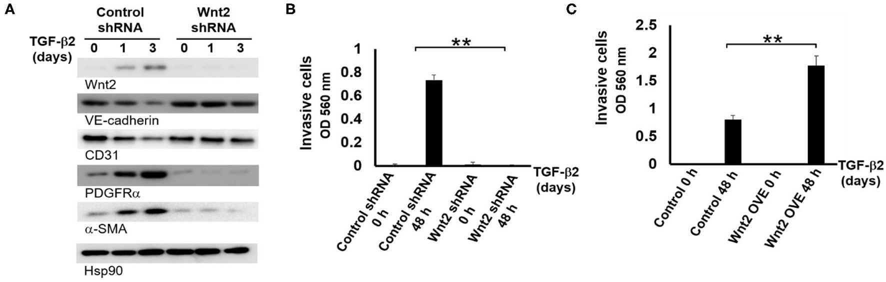 We employed shRNA technology to identify which Wnt protein functions to regulate TGF-β2-induced EndMT. We found that only the silencing of Wnt2 could significantly attenuate TGF-β2-mediated EndMT. In control HAECs transfected with scrambled shRNA, TGF-β2 increased the expression of the mesenchymal markers PDGFRα and α-SMA, and decreased the endothelial markers VE-cadherin and CD31. In shRNA-mediated Wnt2 knockdown (KD) HAECs, TGF-β2 failed to induce the expression of PDGFRα and α-SMA (Figure 4A), However, shRNA-mediated Wnt4, Wnt 10B, or Wnt11 KD in HAECs doesn't significantly attenuate TGF-β2-induced EndMT, which is shown by the levels of EndMT protein markers (Supplementary Figure 2). In addition, Wnt2 silence attenuated the invasive capability of HAECs (Figure 4B) and Wnt2 overexpression (OVE) promoted the invasive capability of HAECs (Figure 4C). Together, our results indicate that Wnt2 facilitates TGF-β2-mediated EndMT.