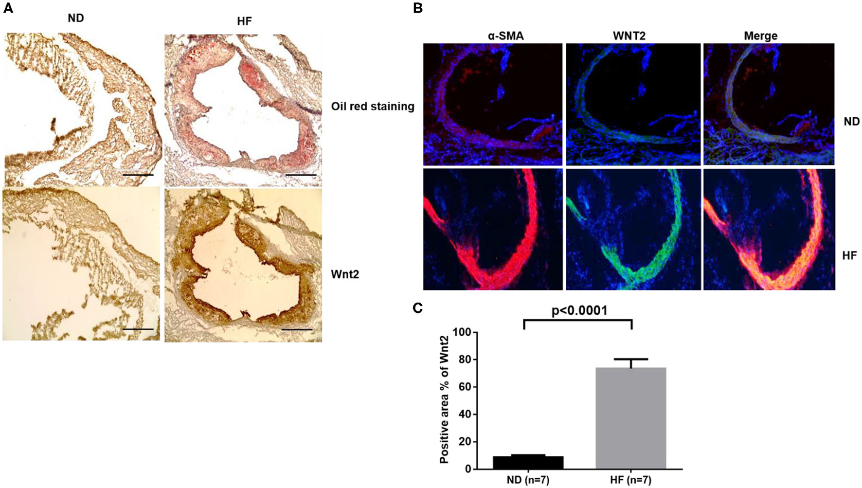Wnt2 is involved in the atherosclerotic lesion development. Upper panels (A): Oil Red O staining of atherosclerotic lesions in the aortic root at the level of the aortic valves of LDLR−/− mice fed on a normal diet (ND) and a high-fat (HF) diet. Lower panels: Immunohistochemistry staining of Wnt2 protein. Magnification is x10, scale bars = 400 μm. (B) Immunostaining for α-SMA (Red) and Wnt2 (Green) expressions in atherosclerotic lesions derived from the aortic valves of LDLR−/− mice fed on a normal diet (ND) and a high-fat (HF) diet. (C) Quantification for the Wnt2 staining area in α-SMA-positive atherosclerotic lesions derived from the aorta. Each value represents the mean ± SD. n = 7.