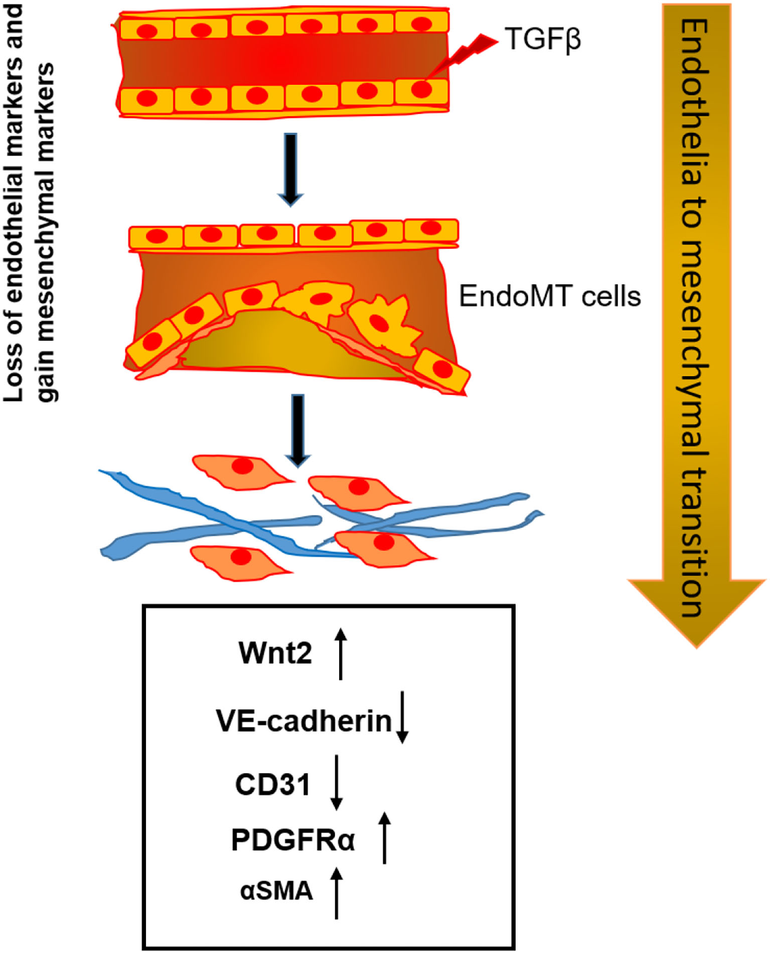 TGF-β induces EndMT in atherosclerosis. The TGF-β signaling activation initiates EndMT and induces changes in the level of the endothelial markers, VE-cadherin, CD31, and the mesenchymal makers, PDGFRα and αSMA. Suppression of endothelial TGF-β receptor expression arrest EndMT development.