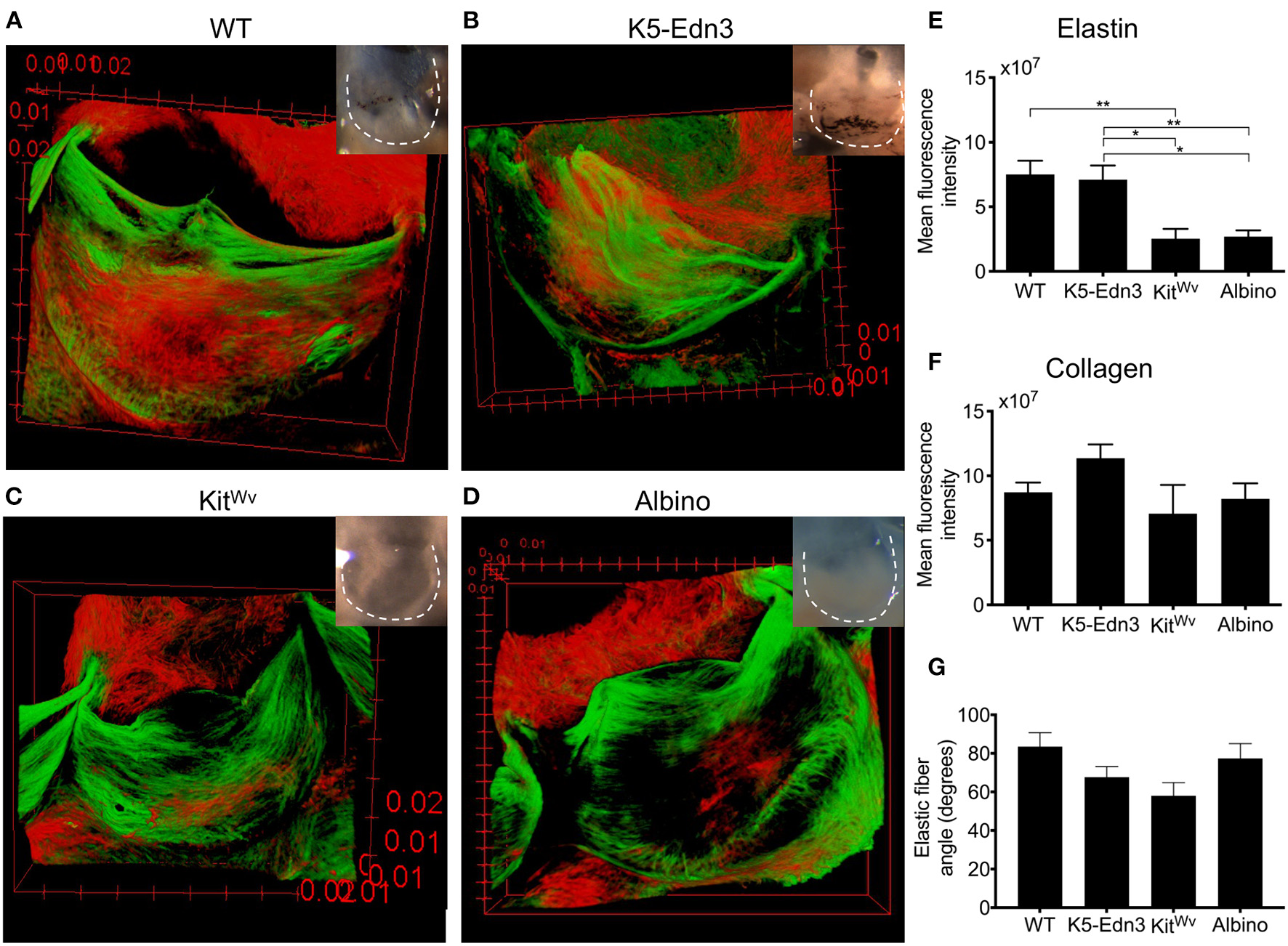 Relationship between pigment variation and ECM in the AoV leaflet. Elastin (red) and collagen (green) staining of 12–13 weeks old mouse wholemount AoV leaflets of (A) WT, (B) K5-Edn3, (C) KitWv, and (D) albino. Leaflets in the optical microscope images correspond to those in the images of the stained leaflets. Quantification of (E) elastin and (F) collagen fluorescence staining. (G) Elastic fiber angle quantification. MAG = 10X. Mean ± SEM shown; **p < 0.001, *p < 0.05. N = 4–5 biological replicates.