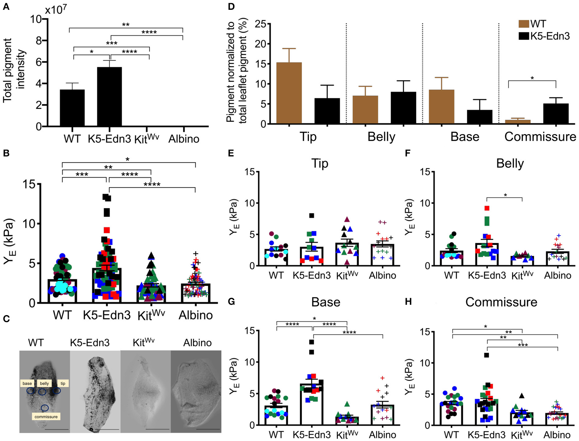 Relationship between pigment variation and stiffness of the AoV leaflet. (A) Total pigment in the wholemount AoV leaflets in the four mouse models. (B) Stiffness measurements of wholemount AoV leaflets of WT, K5-Edn3 (hyperpigmented), KitWv and albino (hypopigmented) mice. (C) Optical microscope image of resected wholemount AoV leaflet from the four mouse models. All the four leaflets are oriented in the same direction. WT label of the four regions corresponds to the other three leaflets, and stiffness and pigment quantification (D) Regional pigment quantification in all four mouse models. Regional stiffness of wholemount AoV leaflets of the four moue models in the (E) Tip (F) Belly (G) Base (H) Commissure. Mean ± SEM shown; ****p < 0.0001, ***p < 0.0005, **p < 0.001, *p < 0.05; N = 4–5 biological replicates per condition. Each color represents a biological replicate, and each color point represents an average of technical replicates of N = 3–4. Scale bar = 100 μm.