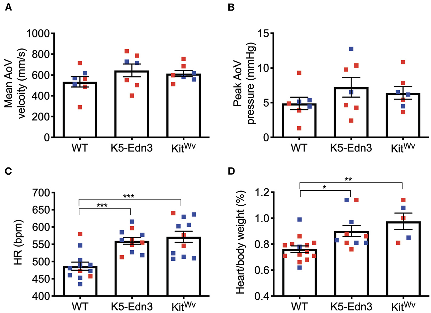 Functional cardiac assessment of mouse models with varying levels of pigmentation in the AoV (WT, K5-Edn3, KitWv). AoV blood flow measurement by pulse wave Doppler imaging (A) Mean AoV velocity (B) Peak AoV pressure (C) Non-invasive tail-cuff method to assess the heart rate. (D) Cardiac hypertrophy was determined by the ratio of heart weight (mg) to body weight (g). Mean ± SEM shown; ***p < 0.0005, **p < 0.001, *p < 0.05; N = 7 animals per group; Male (blue) and female (red); Age: 12–13 weeks old mice.