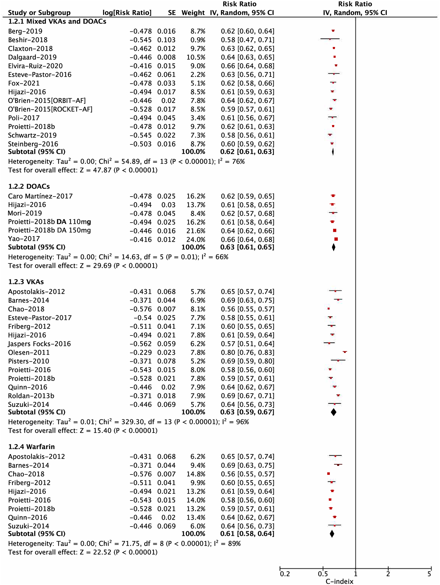 Subgroup analysis for pooling the C-statistic of the Hypertension, Abnormal liver/renal function, Stroke, Bleeding history or predisposition, Labile international normalized ratio, Elderly, Drugs/alcohol concomitantly (HAS-BLED) score based on the types of oral anticoagulation.