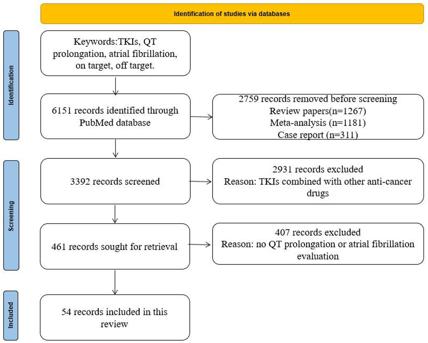 As shown in Figure 1, the data for this review were identified by searches of PubMed and references from relevant articles using the search terms “TKIs,” “QT prolongation,” “atrial fibrillation,” and “on and off-target.” We identified 6,151 records through the PubMed database. We removed 2,759 records as they were review papers (n = 1,267), meta-analyses (n = 1,181), or case reports (n = 311). A total of 2,931 studies on TKIs combined with other anticancer drugs were also removed. Then, 407 records were excluded by reading the abstract. Finally, 54 records were enrolled. Only articles published in English between 2005 and 2021 were included.