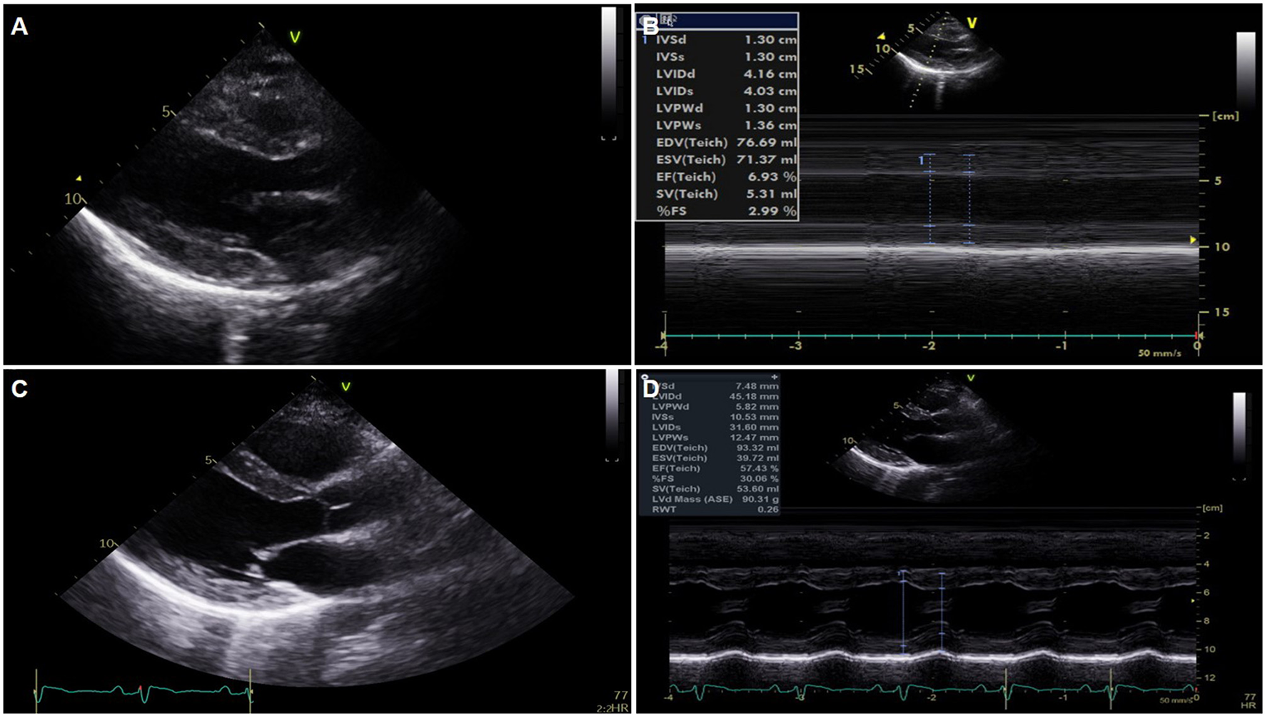 Serial changes of echocardiography. (A,B) Global akinesia with severe left ventricular (LV) dysfunction and marked edematous left ventricular wall thickening on portable echocardiography performed just after extracorporeal membrane oxygenation application. (C,D) Normalized LV function and wall thickness on pre-discharge echocardiography.