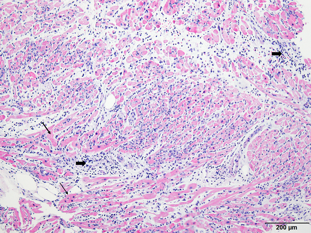 Histopathologic examination of endomyocardial biopsy revealed marked and diffused infiltration of lymphocytes (thick arrow) within the myocardium (thin arrow) (×40, Hematoxylin-eosin stain).