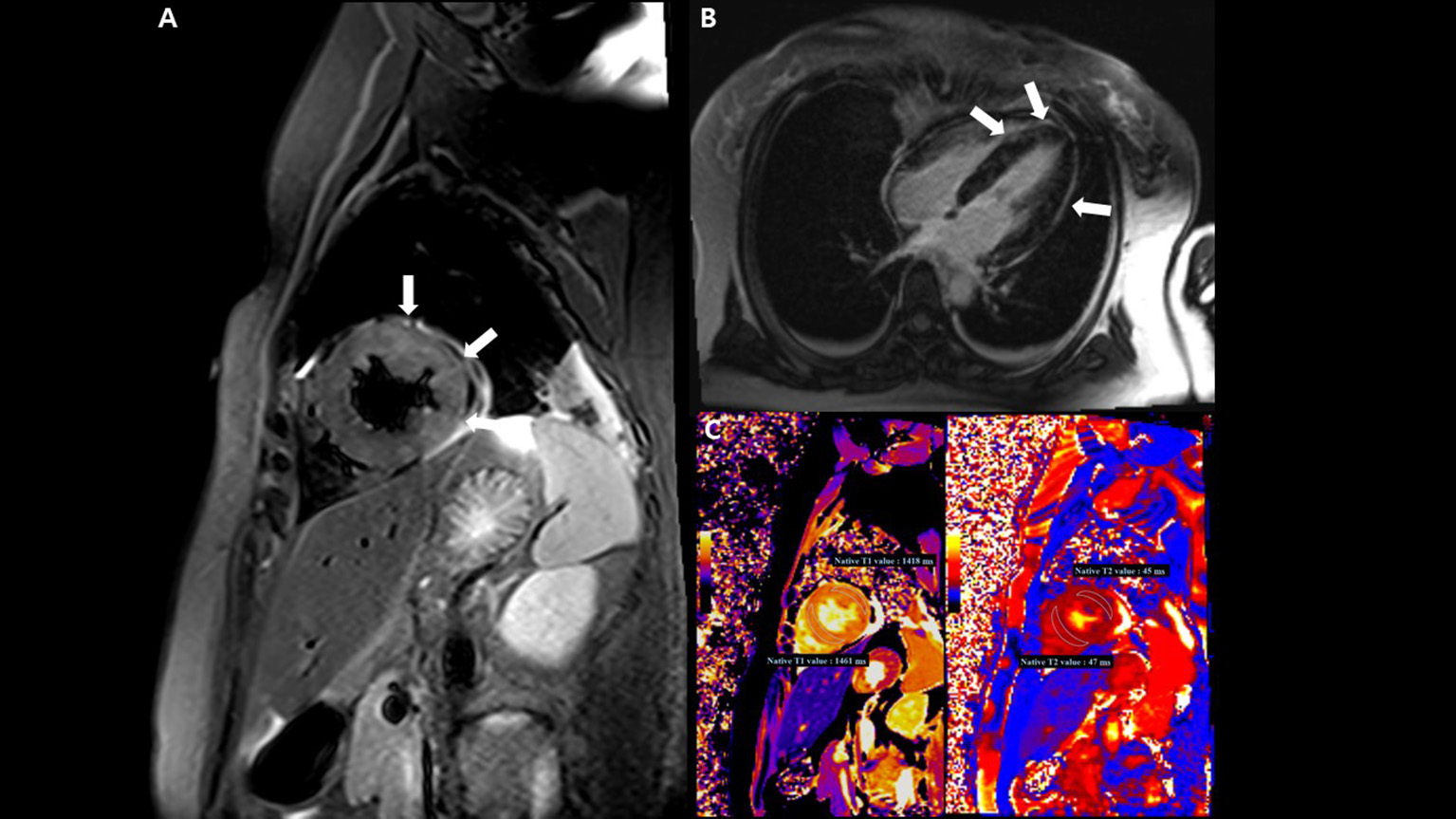 On the tenth day, cardiac magnetic resonance imaging was performed, which showed multifocal lesions with high signal intensity in T2 weighted images (Figure 4A) and a positive late gadolinium enhancement (Figure 4B) which implies myocardial edema and necrosis, respectively. In addition, both T1 and T2 relaxation times at the LV wall were also increased (Figure 4C).