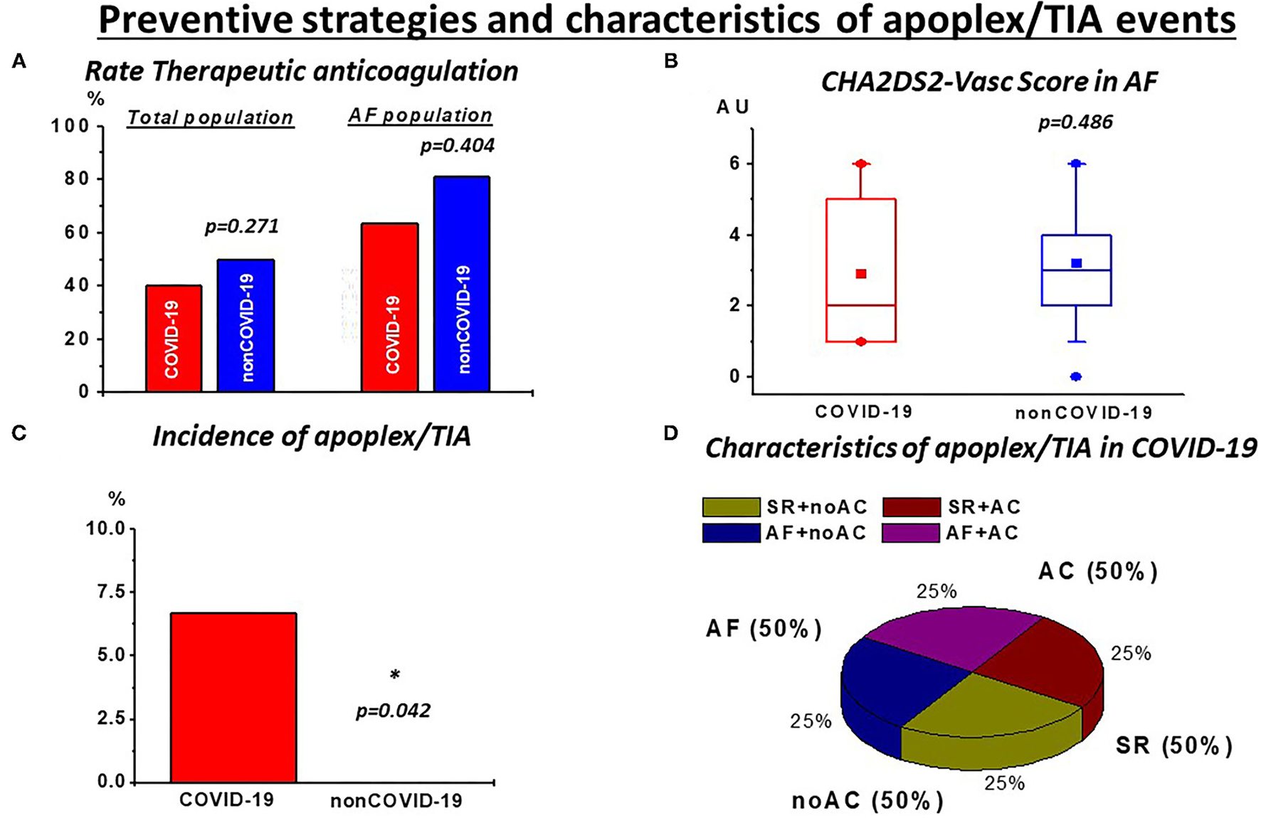 In summary, AF is common in severe COVID-19, but we found it to be less frequent than in severe pneumonia of non-COVID-19 origin. Arrhythmia might be mainly attributed to a high inflammatory activity and disease severity, instead of a COVID-19 specific mechanism. The contrasting higher incidence of stroke, despite the lower rate of AF, seems to be a disease-specific feature of critical COVID-19, consistent with high rates of pulmonary embolisms. Further research will hopefully clarify the potential role of TAC to prevent thromboembolic events, which are independent of AF.
