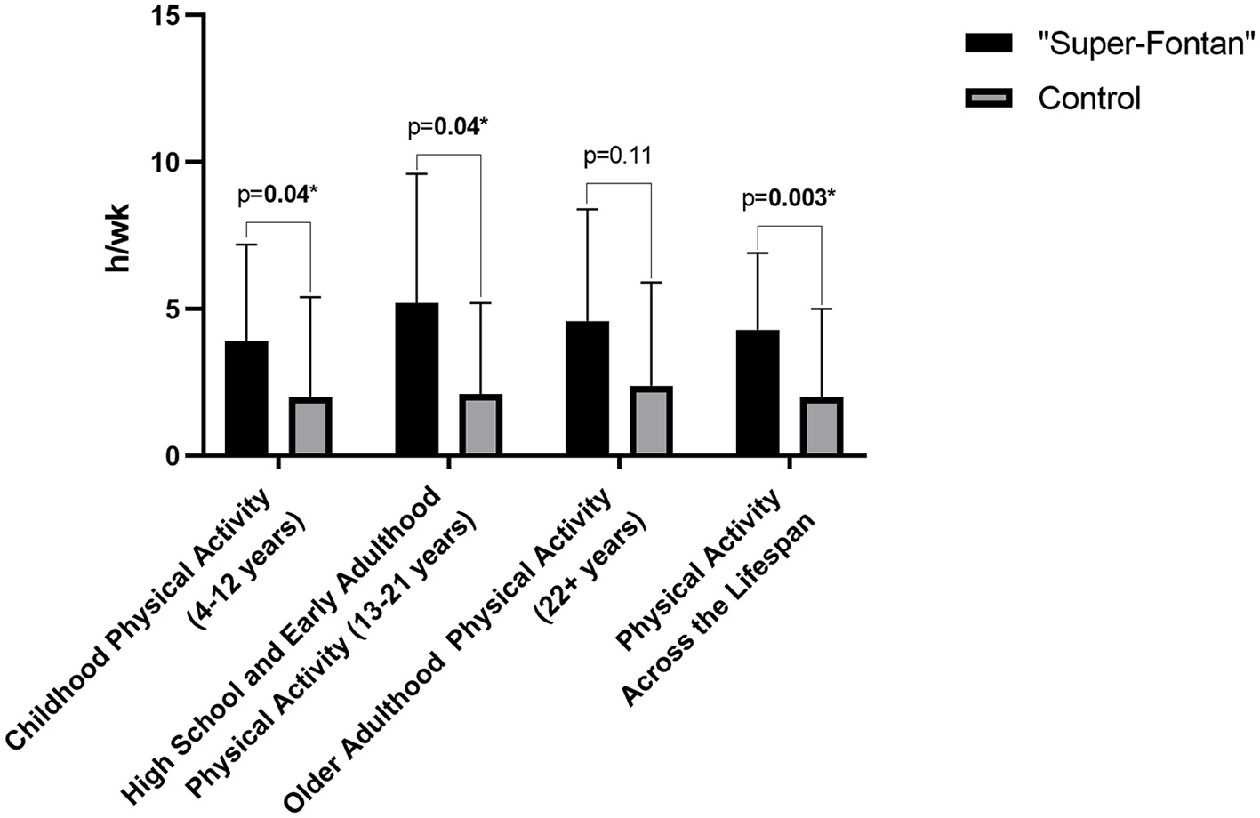 To assess structured sport and physical activity participation across the lifespan, we used a modified version of the Kriska long-term recall physical activity questionnaire (24). Participants were asked to recall the sports and physical activities they participated in across multiple age ranges. For each sport and physical activity reported, the years in each age range, duration (hours) per month, and months per year were recorded. Sports and physical activities were categorized as childhood (ages 4–12 years), high school and early adulthood (ages 13–21 years), older adulthood (ages 22+ years), and physical activity across the lifespan (four to the age at questionnaire completion). The total hours of sport or physical activity participation were summated for each category and indexed as an average per week (h/wk).