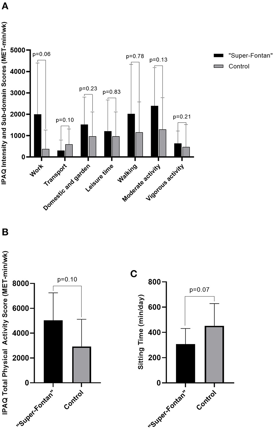Methods: People with a “Super-Fontan” phenotype were defined as achieving normal exercise performance [≥80% predicted peak oxygen uptake (VO2) and work rate] during cardiopulmonary exercise testing (CPET) and were identified from the Australian and New Zealand Fontan Registry. A Fontan control group that included people with impaired exercise performance (<80% predicted VO2 or work rate) was also identified based on a 1:3 allocation ratio. A subset of participants were prospectively recruited and completed a series of physical activity, exercise self-efficacy, and health-related quality of life questionnaires.