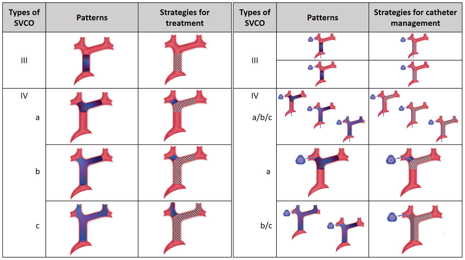 A comprehensive classification of SVCO based on previsouly published works (7, 8) integrating anatomic patterns that may impact the treatment strategy is provided here: