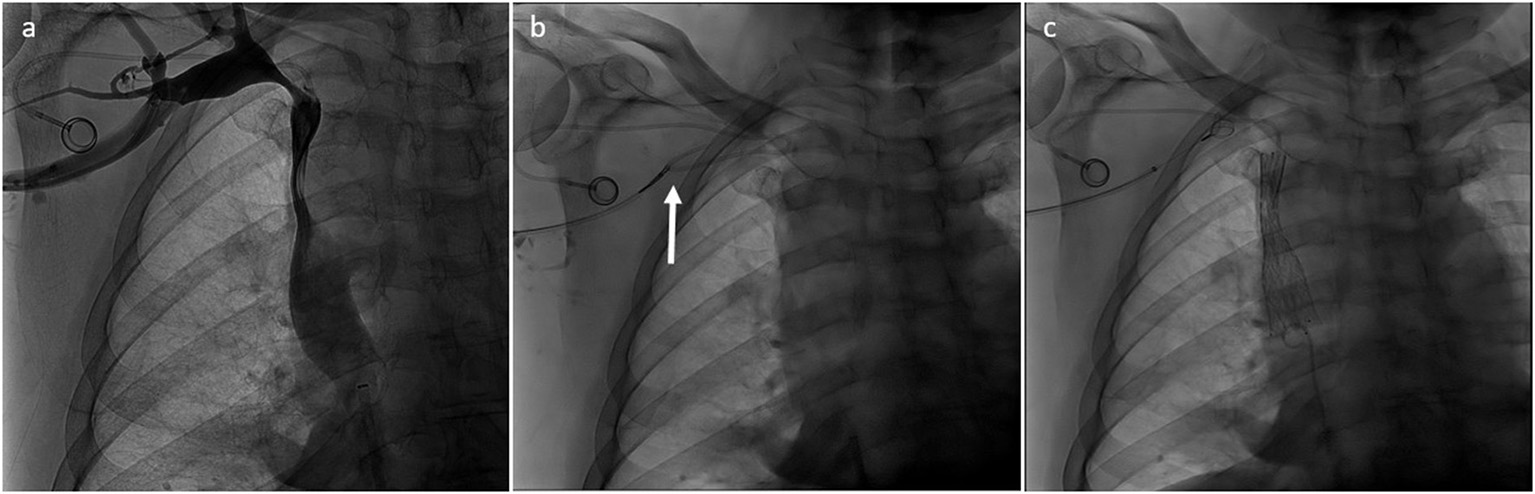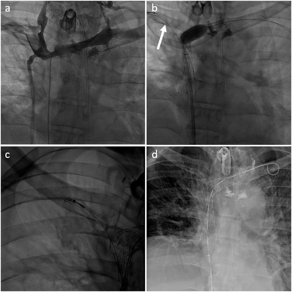 Preserving previously implanted central venous catheters can be challenging when treating SVCO. First of all, tip positioning must be precisely determined. According to Glauser et al., three types are distinguished (36). In type I positioning, the tip is located more than or <1 cm from the superior cavoatrial junction (CAJ). Endovascular reconstruction of the superior vena cava is usually possible without mobilization of the catheter. The catheter will be flattened between the stent wall and the vessel, but the tip will stay free at the cavoatrial junction, saving device function. On the contrary, in some type II or III positioning, the catheter tip is suboptimal or non-optimal. In type II positioning, the tip is located >1 cm above or below the cavoatrial junction. In type III, the tip is located >3 cm below the CAJ or not inside the SVC. Stenting at the tip level may render the catheter unusable (type II or III with the tip above the CAJ). In such cases, the catheter should be withdrawn from the venous segment treated before endovascular reconstruction and then repositioned in the stent lumen. This maneuver is typically performed by brachial access using a snare to catch and mobilize the tip (35, 37). Figures 2–4 show examples of treatments. Sometimes, a supplemental manoeuver of mechanical adhesiolysis is required to allow catheter mobilization (38).