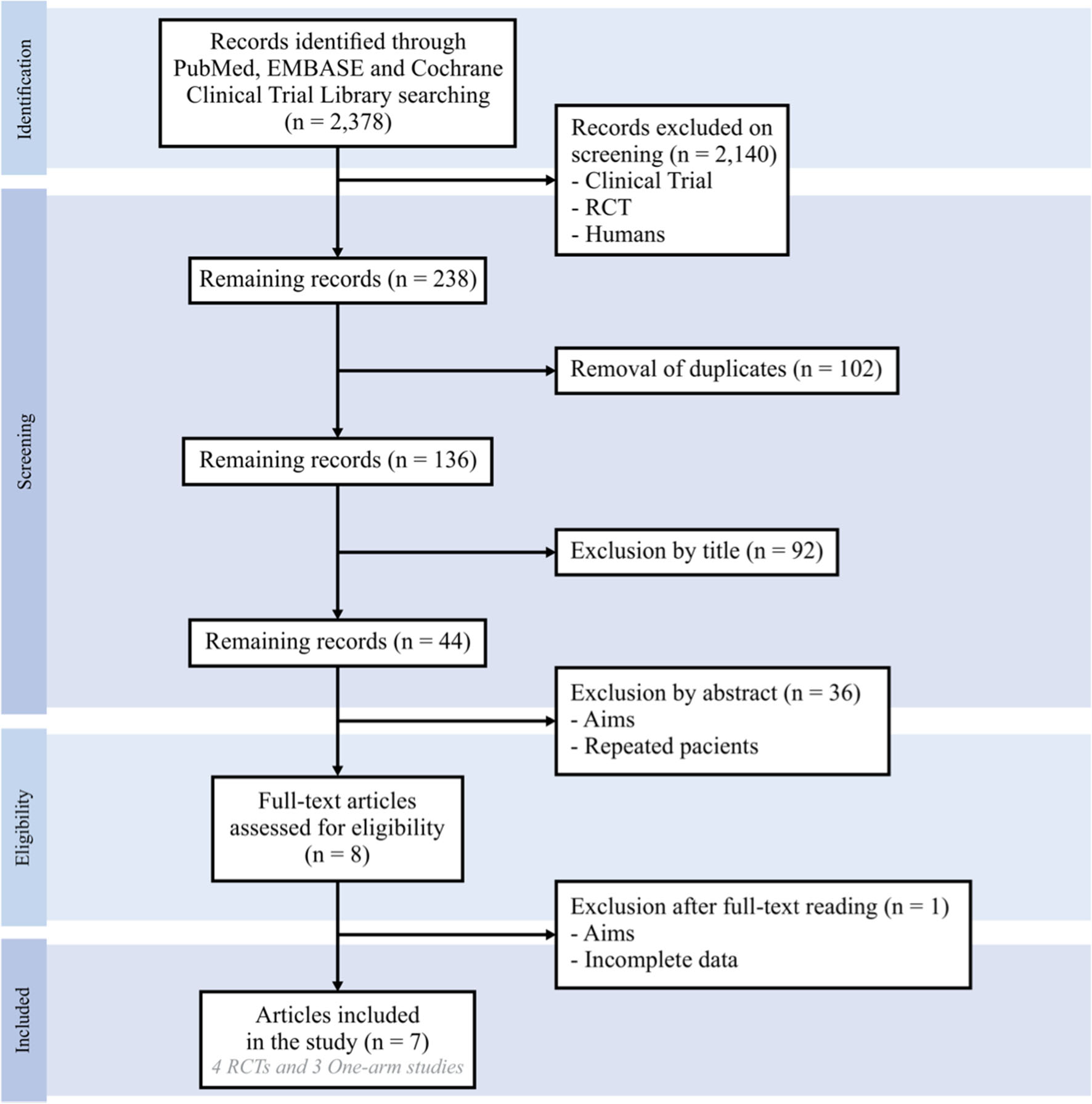 The initial list of articles generated was initially filtered for clinical trials, and then duplicates were removed. The selected titles had the abstracts analyzed. All these steps were done by three researchers (LBS, FMS, and EAF) using the above-described criteria. Disagreements between investigators were solved by a discussion with a senior researcher (FMS). Finally, all studies selected were read by all the authors to confirm eligibility, and results were tabulated according to the specific description of the selected studies and reviewed for further statistical analysis.