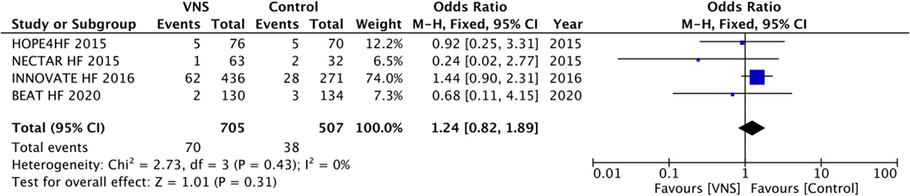 Methods: From May 1994 to July 2020, a systematic review was performed using PubMed, Embase, and Cochrane Library for clinical trials, comparing VNS with medical therapy for the management of chronic HFrEF (EF ≤ 40%). A meta-analysis of several outcomes and adverse effects was completed, and GRADE was used to assess the level of evidence.