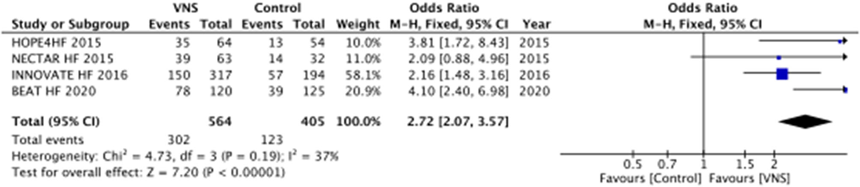 Results: Four randomized controlled trials (RCT) and three prospective studies, totalizing 1,263 patients were identified; 756 treated with VNS and 507 with medical therapy. RCT data were included in the meta-analysis (fixed-effect distribution). Adverse effects related to VNS were observed in only 11% of patients. VNS was associated with significant improvement (GRADE = High) in the New York Heart Association (NYHA) functional class (OR, 2.72, 95% CI: 2.07–3.57, p < 0.0001), quality of life (MD −14.18, 95% CI: −18.09 to −10.28, p < 0.0001), a 6-min walk test (MD, 55.46, 95% CI: 39.11–71.81, p < 0.0001) and NT-proBNP levels (MD −144.25, 95% CI: −238.31 to −50.18, p = 0.003). There was no difference in mortality (OR, 1.24; 95% CI: 0.82–1.89, p = 0.43).
