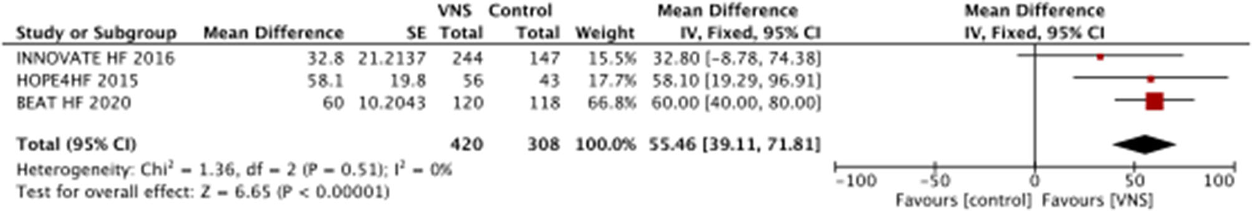 Data were separated into two distinct groups for comparisons: VNS and no VNS (control) and compared by fixed-effect distribution tests. The variability of the results between the studies (τ2) was considered the same for the two groups, and differences between the groups were considered statistically significant if p < 0.05; all tests were two-tailed.