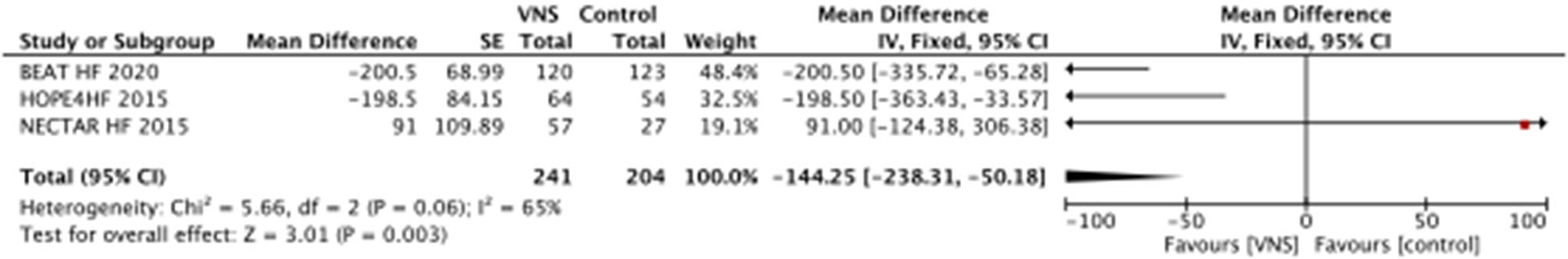 | NT-proBNP (pg/ml)Follow up: median 6 months | The median NT-proBNP (pg/ml) was 970.5 pg/ml | MD 144.25 pg/ml lower (238.31 lower to 50.18 lower) |