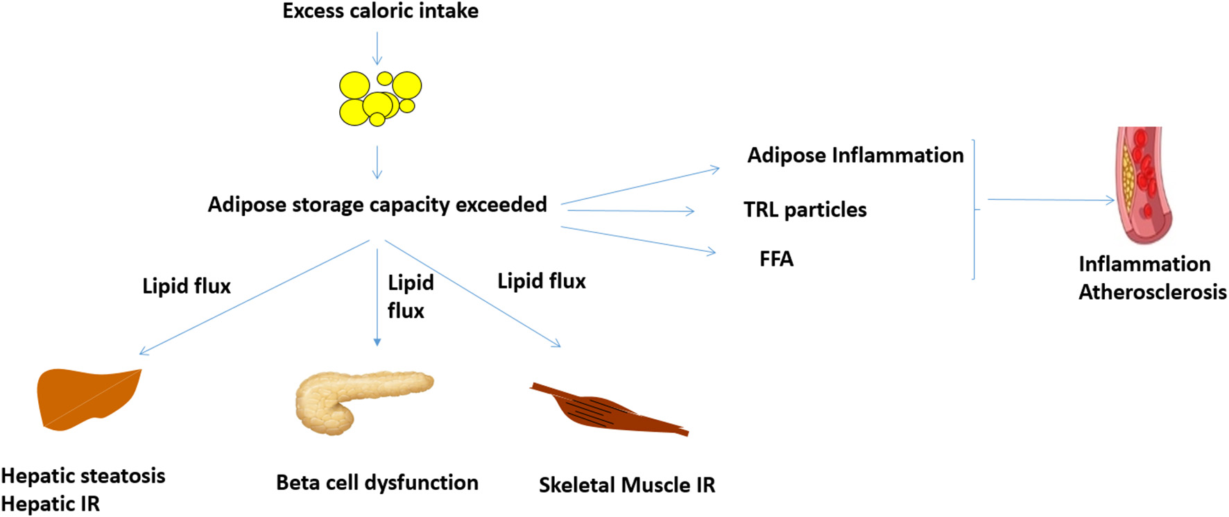 Proposed mechanisms linking obesity, inflammation and cardiovascular disease. When adipose storage capacity is exceeded, increased lipid flux, and ectopic lipid in liver, skeletal muscle, and pancreas reduce insulin sensitivity and beta cell function. Compromised adipose storage is also associated with adipose and systemic inflammation, which can potentially potentiate atheroma development. Increased TRL and FFA, which are features of insulin resistance, may also increase inflammation and atheroma development. FFA, free fatty acids; IR, insulin resistance; TRL, triglyceride rich lipoproteins.