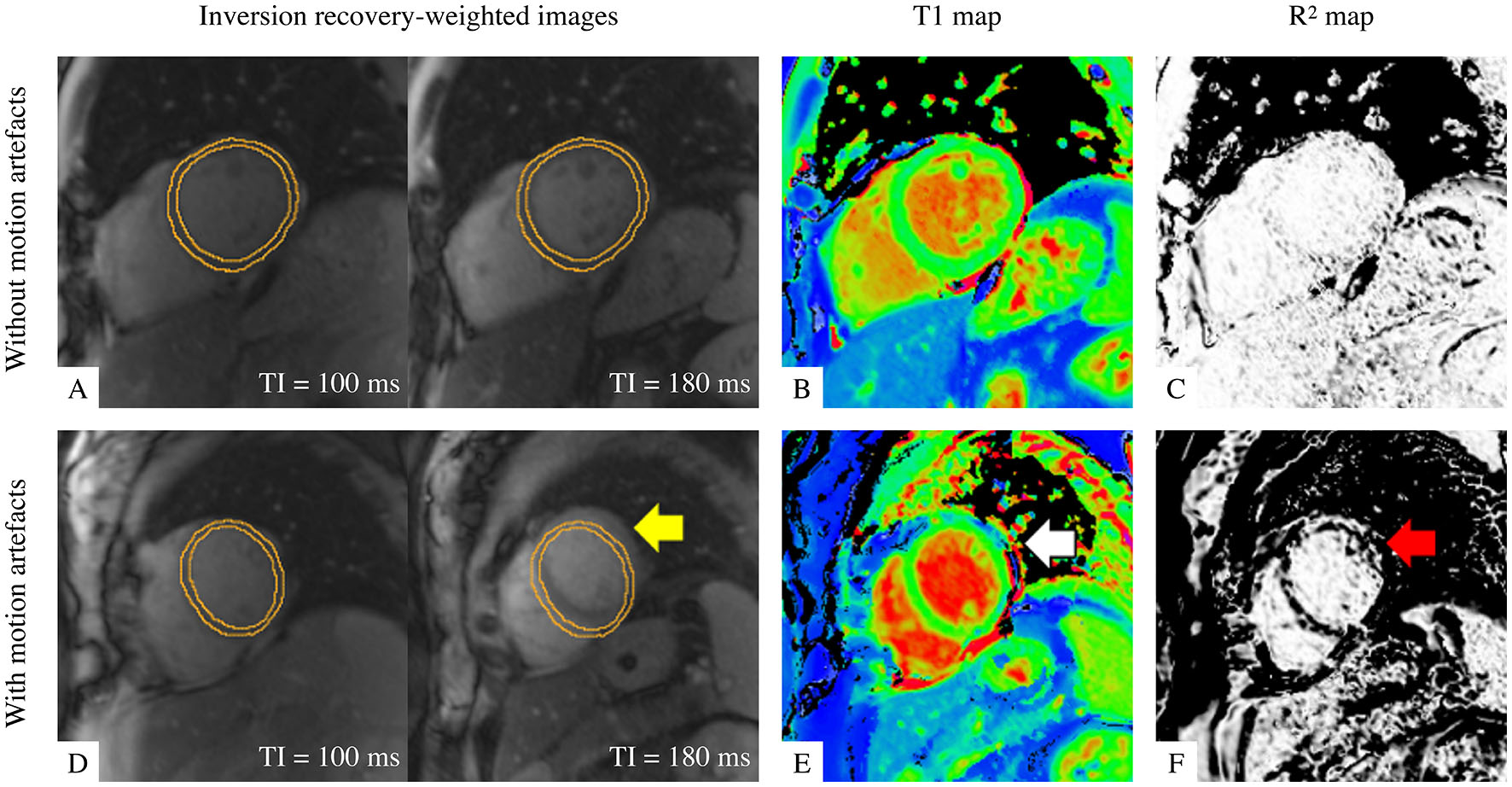 Illustration of T1 maps with good quality (top row) and with motion artefact (bottom row). (A,D) Two examples out of seven of inversion-recovery weighted (IRW) images required for T1 map reconstruction are shown, time-stamped with their corresponding inversion times (TI) and overlaid by identical manual myocardial contours for identifying motion. (B,E) ShMOLLI T1 maps. (C,F) R2 quality control maps. A good quality T1 map is indicated by (A) myocardium in same position and (C) “all white” in the left ventricular myocardium indicating high T1 fitting confidence. A T1 map with motion artefact is evident by misalignment in IRW images (yellow arrow), suspicious features in T1 map (white arrow) and dark bands in R2 map in the left ventricular myocardium as evidence of poor T1 fitting (red arrow).