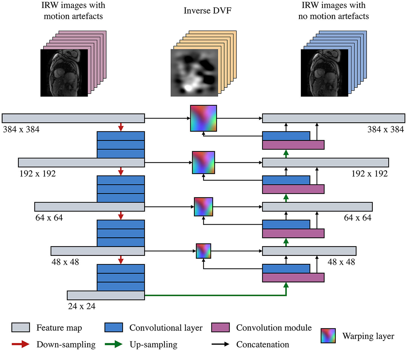 The IRW images are first fed in a sequence of convolution and downsampling operations to produce features at multiple scales on a per-channel basis. The features, from low to high resolutions, are then used as input of convolution modules to produce DVFs. Each convolution module takes as input the features from the previous step, the DVF at the previous scale, and the warped features from the downsampling stage. Applying warping at each of the 4 scales enables the use of residual motion information to be corrected and refined in the next scale. Hence, the neural network generates the DVFs in a coarse-to-fine manner and adds more details with higher resolution in each subsequent level, with a loss function defined at each scale to further supervise the learning manner.