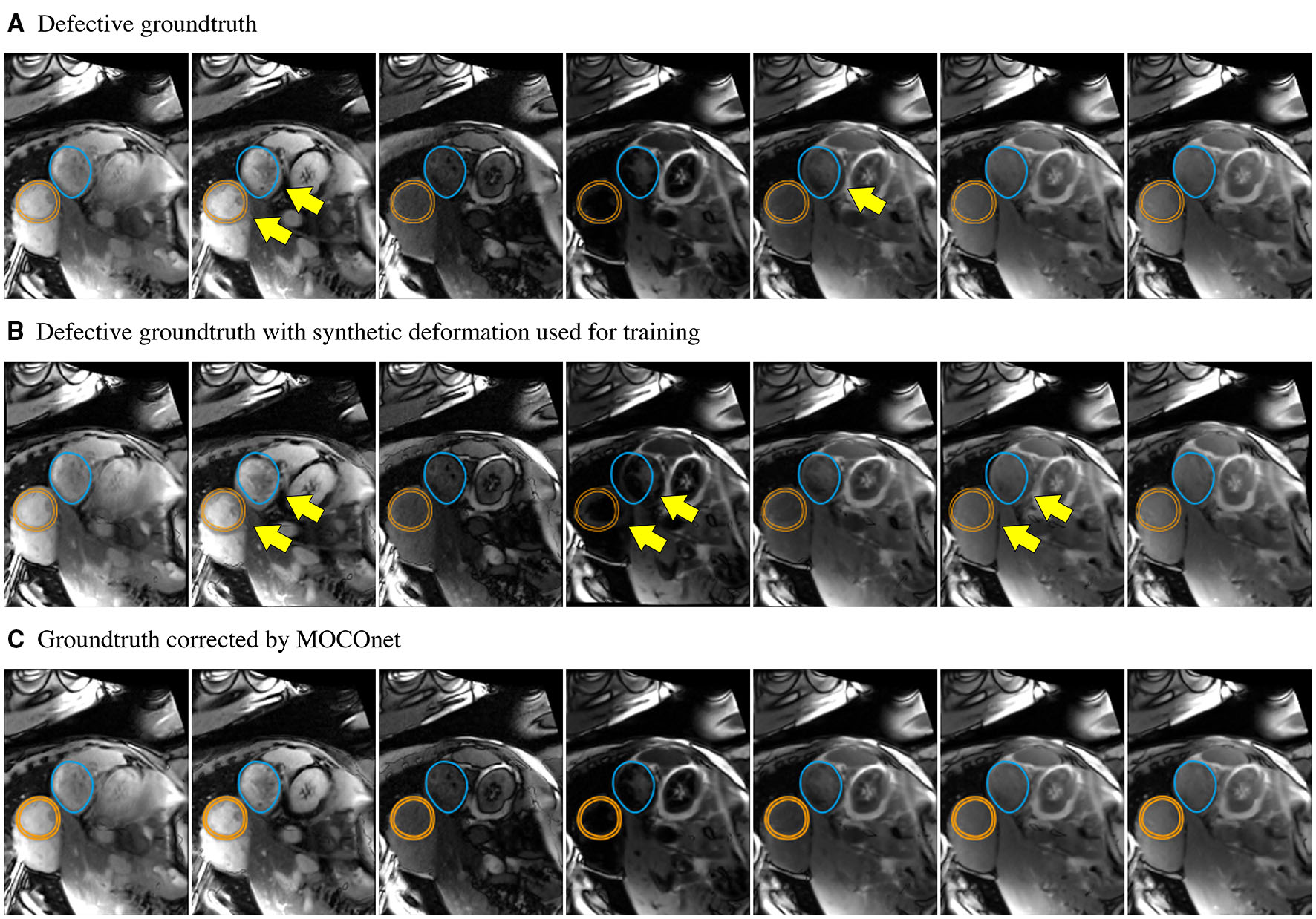 Robustness of the proposed motion correction convolutional neural network (MOCOnet) for myocardial ShMOLLI T1 mapping from a noisy training sample. (A) Training sample falsely considered free of motion (1 in 1,536) as manually depicted with unaligned myocardium (orange) and stomach (blue) with yellow arrows throughout the inversion recovery-weighted images. (B) Applied deformation to the training sample used for training. (C) Sample corrected by MOCOnet after training demonstrating the successful learning of the general rule without replicating the data.