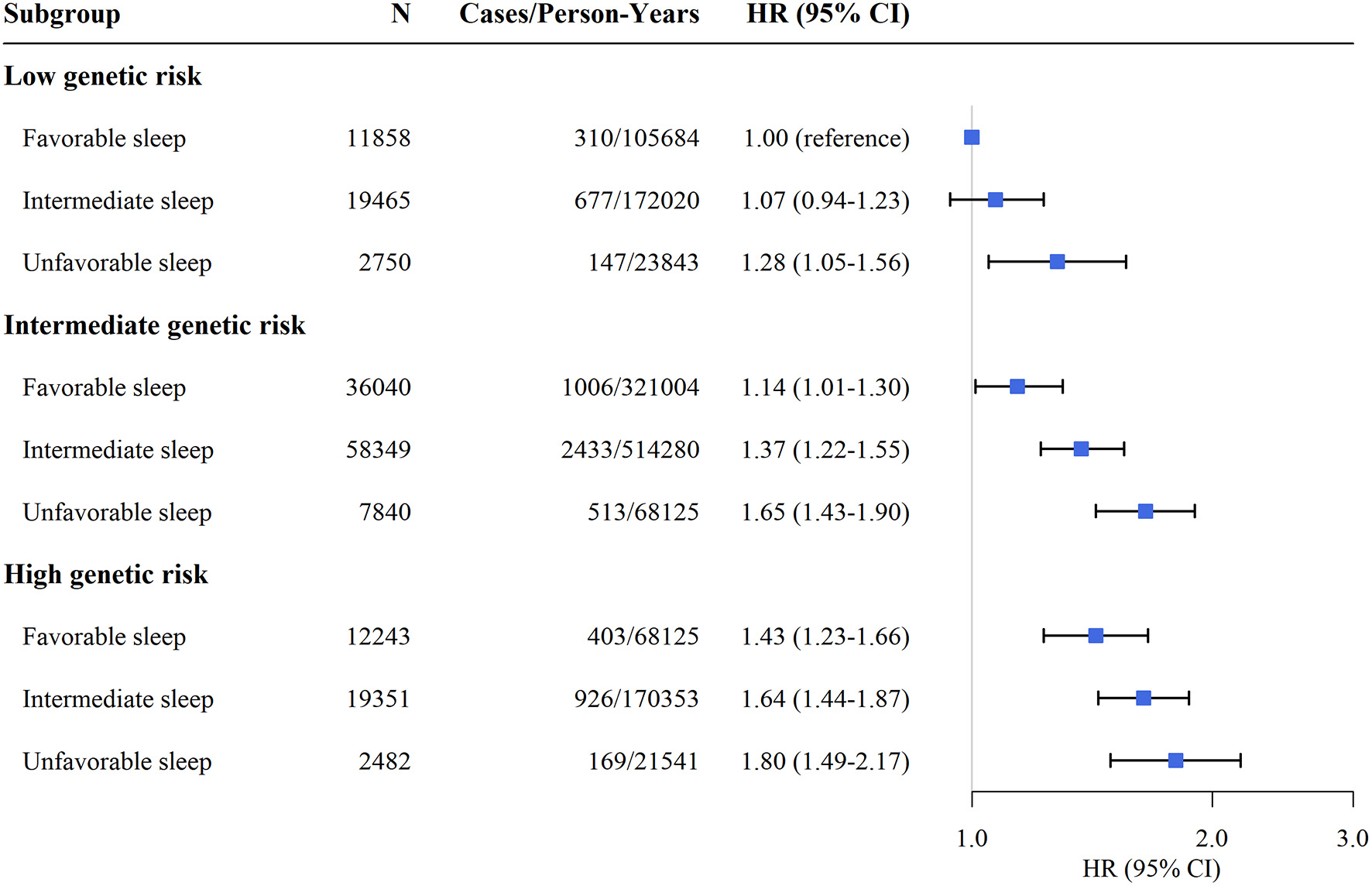 Methods: This population-based prospective cohort study included 170,378 participants from the UK Biobank study. We conducted a healthy sleep score based on a combination of major five sleep factors and a genetic risk score based on 118 risk variants. Cox proportional hazard regression models were used to estimate hazard ratios (HRs) and 95% confidence intervals (CIs).