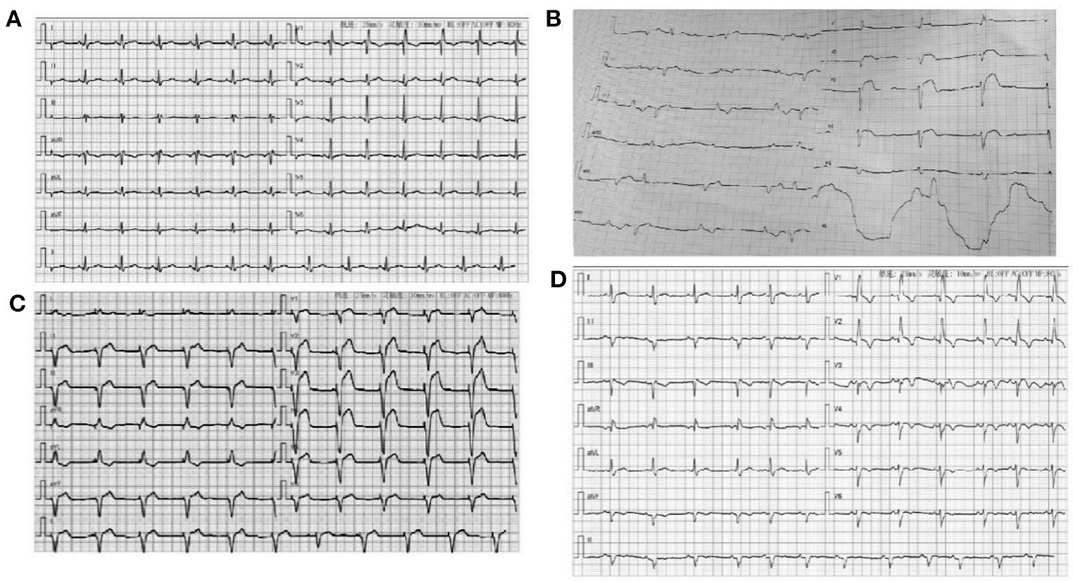 (A) ECG for the woman patient when admitted to hospital: Sinus rhythm Right bundle branch block; (B) ECG of the man patient when admitted to hospital; V1–V3 lead ST-elevation and third-degree atrioventricular block; (C) ECG of the man patient when implanted with temporary pacing; (D) ECG of the man patient at discharge: Sinus rhythm, Right bundle branch block.