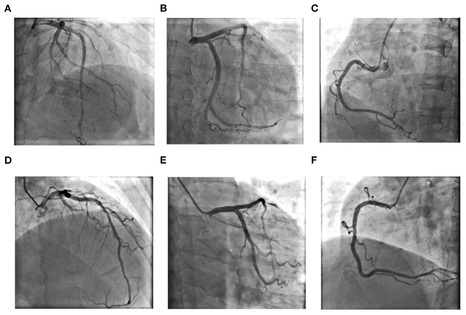 Coronary angiography results for Case 1 (A–C): (A) Left coronary artery: Cranial 30°; (B) Left coronary artery: Caudal 30°; (C) Right coronary artery: Left anterior oblique 45°; Coronary angiography results for Case 2 (D–F): (D) Left anterior oblique 30°+ Cranial 30°; (E) Left coronary artery: Caudal 30°; (F) Right coronary artery: Left anterior oblique 45°.