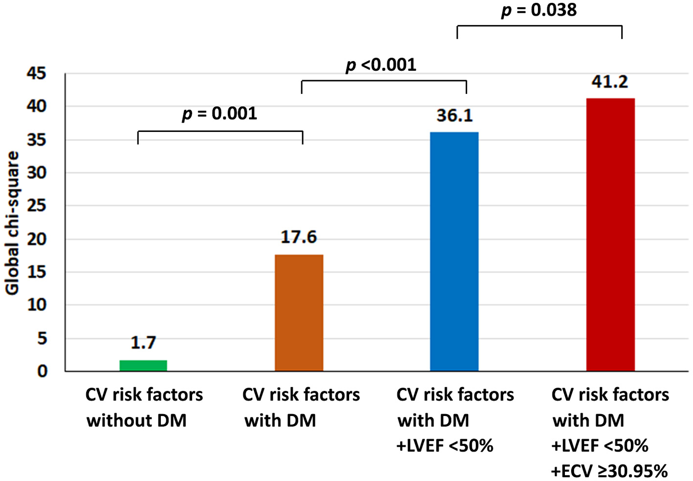 Although LGE was a significant predictor for clinical outcome in the univariate analysis, it was removed from the final multivariate model. LGE, LVEF < 50%, and high ECV are variables derived from CMR and the three variables may have different impacts on the incremental prognostic value. We tested this hypothesis by running an analysis on the incremental prognostic value three times with the simulation of the presence of the data on two components and adding the third component. We found that with the presence of data of LVEF < 50%, and high ECV, adding LGE data did not significantly increase the prognostic value. However, LVEF < 50% or high ECV significantly increase the prognostic value when they were added as the third variable. This finding means that LVEF < 50% and high ECV were more significant predictors than LGE.