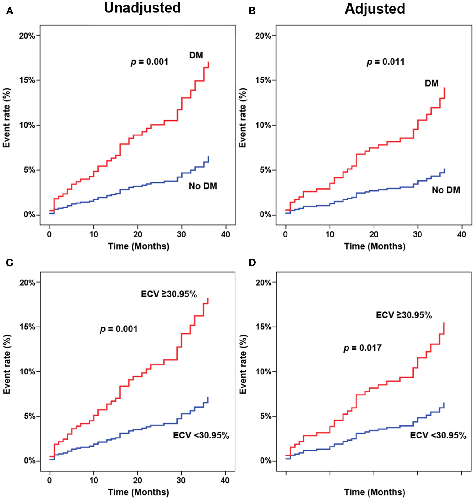 We also performed a sensitivity analysis using ECV based on the results of actual Hct with 6 months before CMR which was available in 358 (48.4%) patients. ECV derived from the actual Hct had an HR and 95% CI for clinical outcomes of 3.37 (1.62–6.98). Multivariate analysis using ECV derived from actual Hct demonstrated that T2D, LVEF < 50%, high ECV (the fourth quartile of ECV and history of myocardial infarction were in the final model. The HR and 95% CI of ECV in the multivariate model were 2.50 (1.18–5.28).
