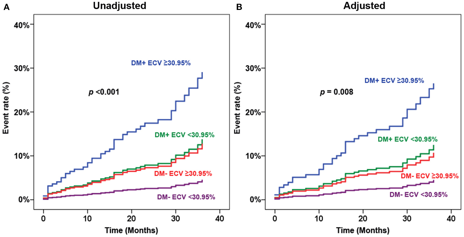 Late gadolinium enhancement (LGE) is a good predictor of clinical outcomes in patients with T2D (17). Stress CMR images had an add-on predictive value on top of LGE in patients with and without T2D (18, 19). It helps reclassify risk in patients with T2D who were referred for stress CMR. LGE is a hallmark for poor outcomes in patients with T2D whereas myocardial ischemia was a good predictor both in patients with and without T2D (19). Our study explores the predictive value of ECV which is another aspect of CMR in patients with T2D.